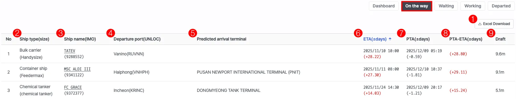 Clicking the On the way tab displays a list of inbound vessels along with ETA and PTA information.