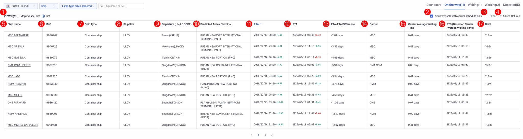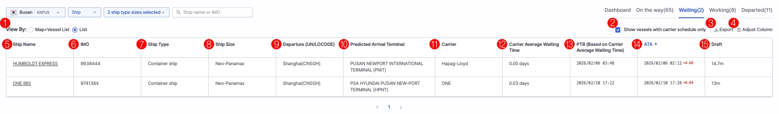 15 | Carrier Average Waiting Time | Average waiting time based on the operating carrier (displayed for schedule-based vessels only) |