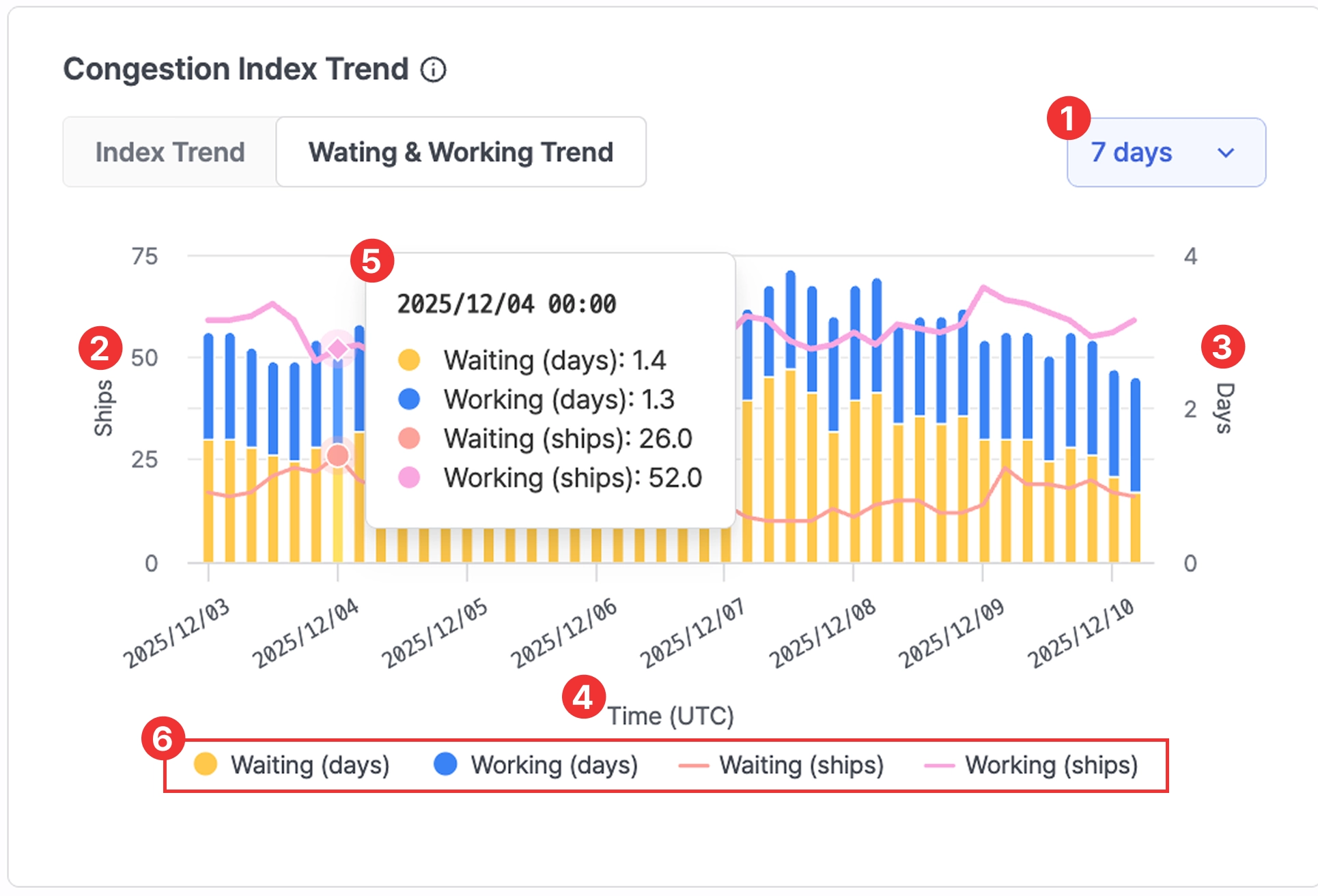 Port insight > Congestion Index Trend > Waiting & Working Trend 7-day view