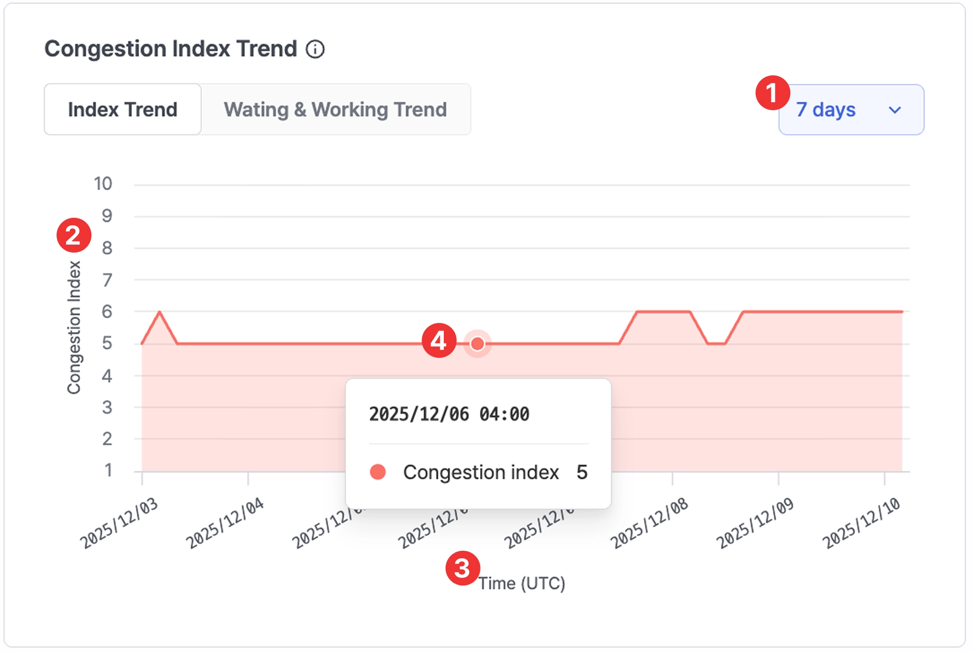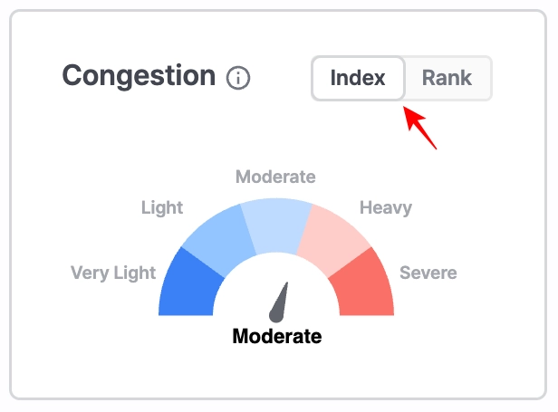 Displays congestion levels scaled from 1 to 10, based on the current congestion compared to long-term average conditions. Higher values indicate heavier congestion.
