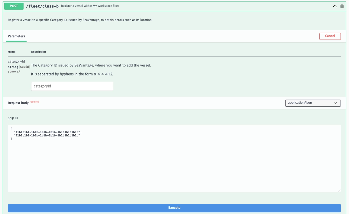 해당 API는 지정된 categoryId에 Class B 선박을 등록하며, categoryId 를 입력하지 않아도 Class B 선박은 워크스페이스에 등록됩니다.