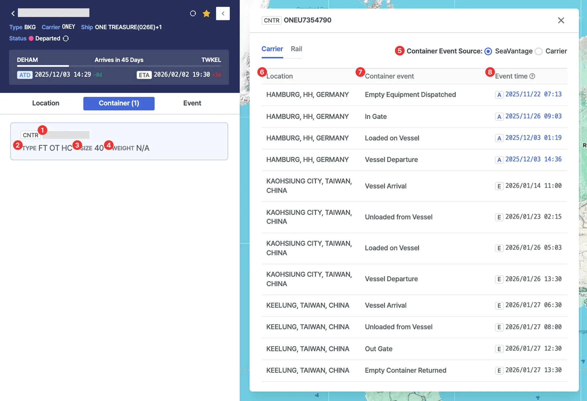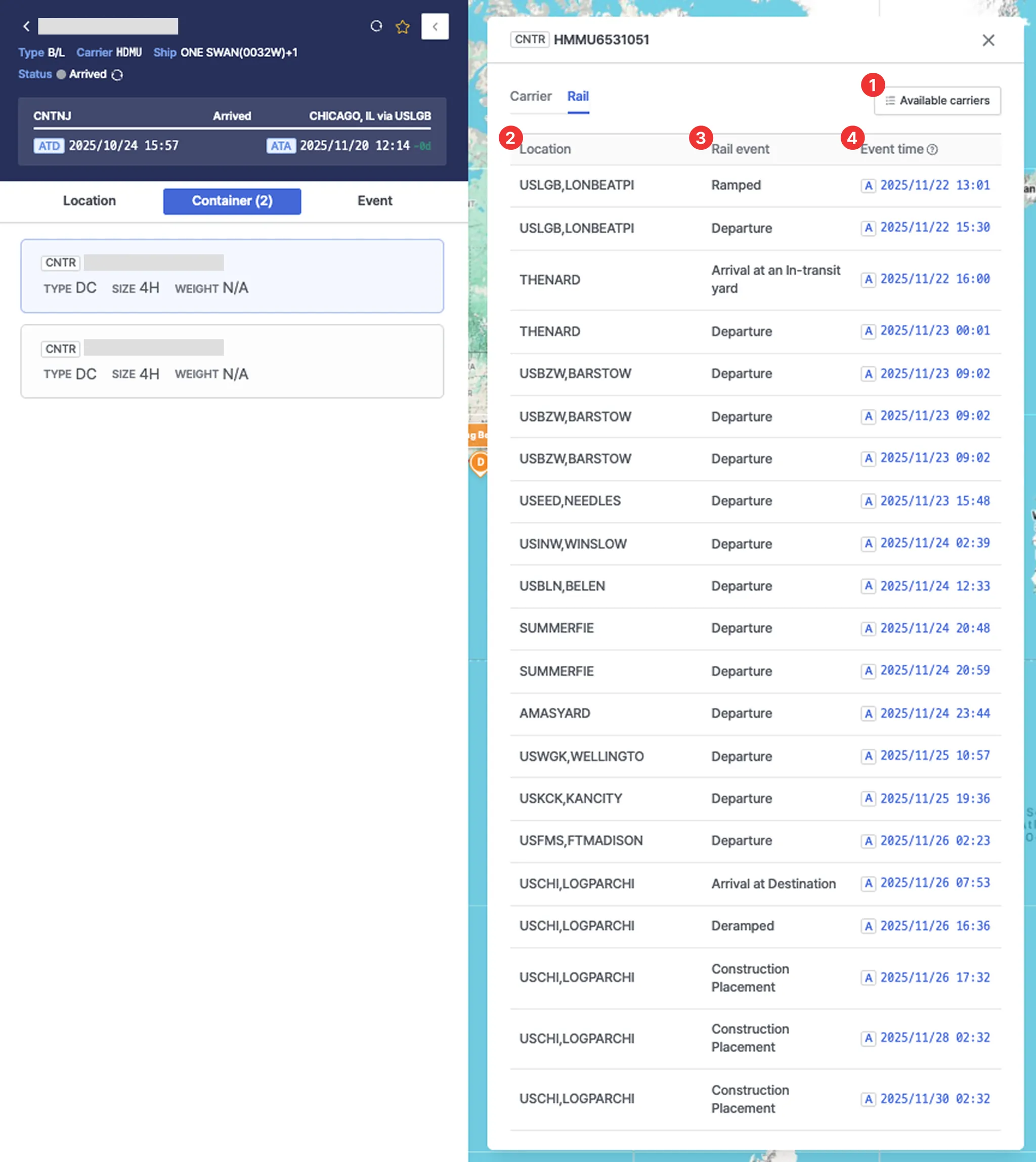 - Carrier: 선사에서 제공하는 컨테이너 이벤트 정보 표시 |