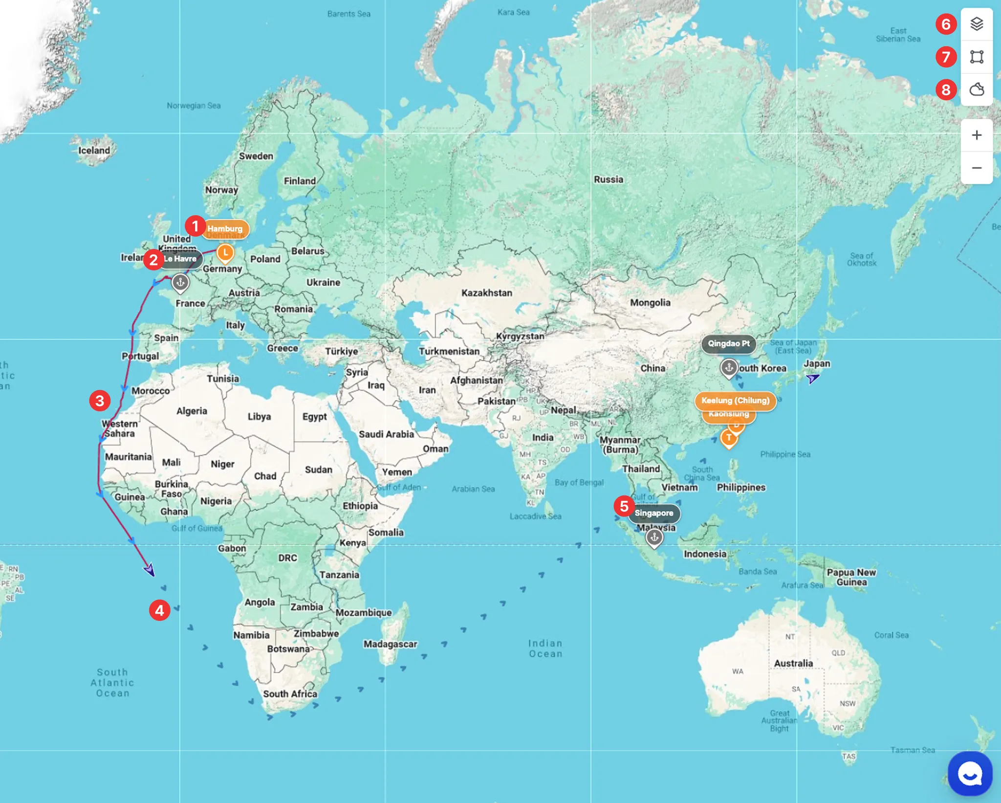 선적의 전체 운항 경로, 선박 위치, 포트콜 정보, 컨테이너 이벤트 등을 실시간으로 확인할 수 있습니다.
