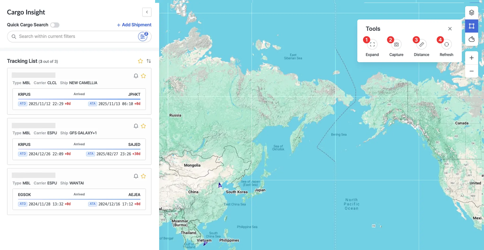 Cargo Insight에 등록된 선적에 대해 운송 중인 선박이 지도에 표시됩니다.