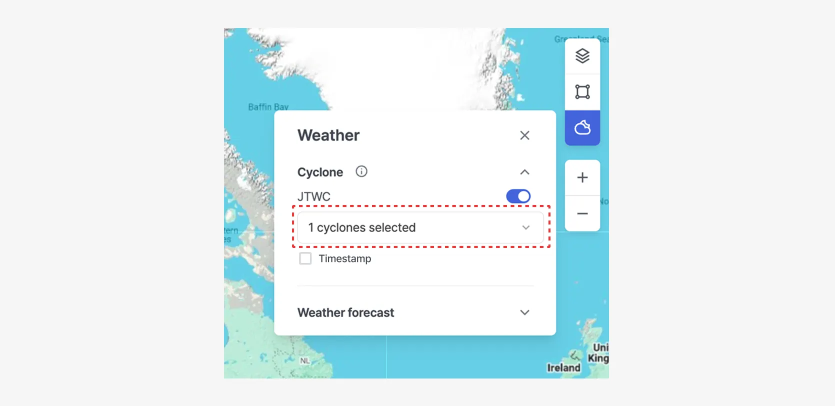 Cargo Insight > 지도 영역 > Weather > Cyclone 에서 Timestamp가 표시된 화면