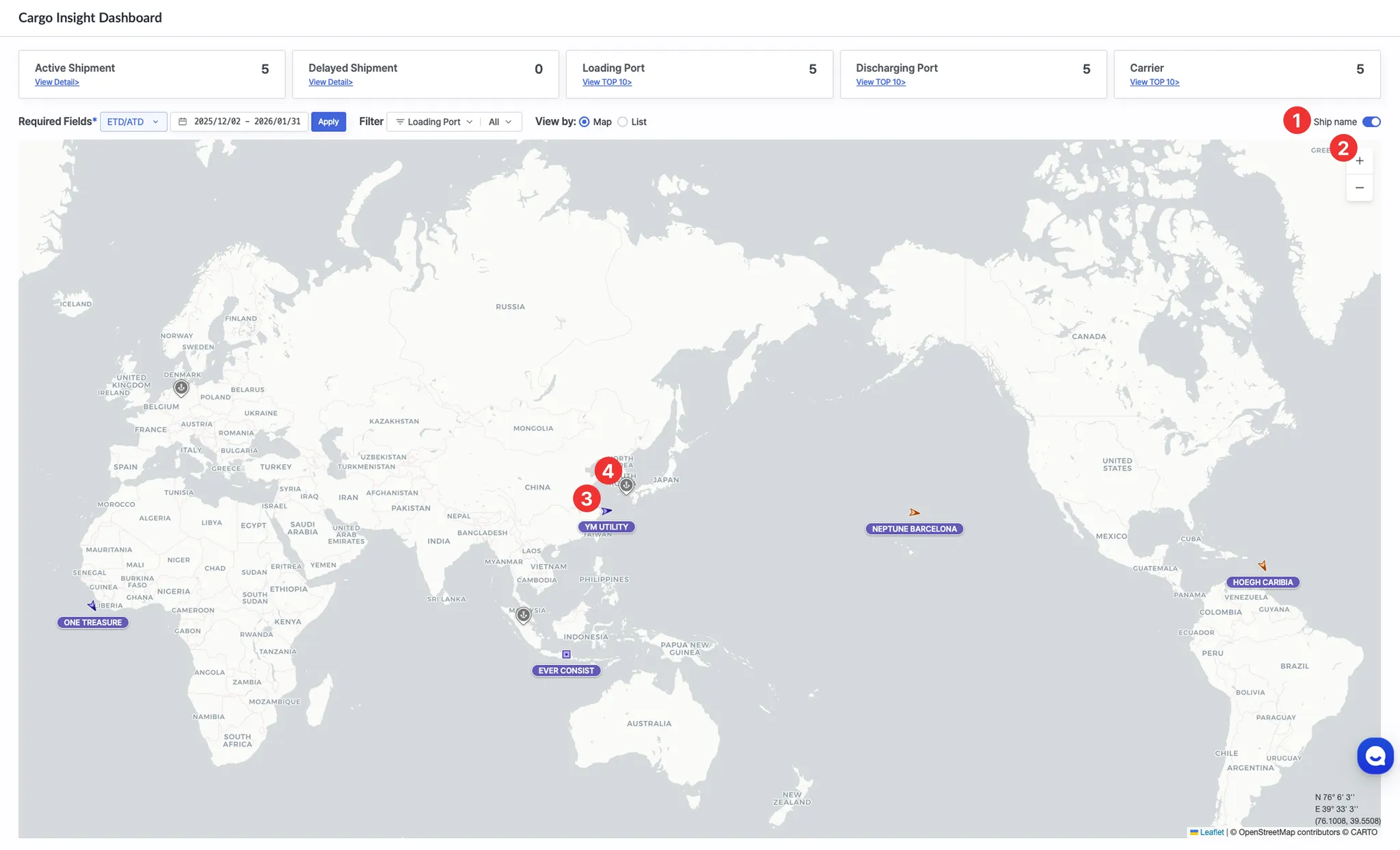 Cargo Insight Dashboard > View by를 Map으로 선택하고, Ship name 토글을 켠 상태