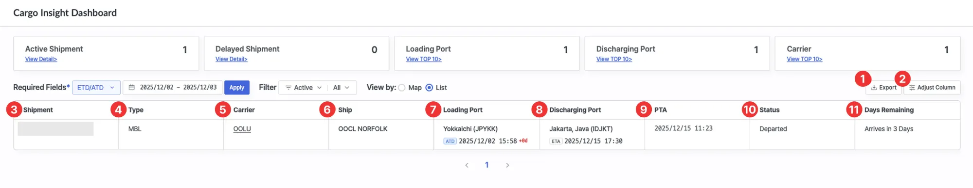 1 | Required Fields | All default queries in the Cargo Insight Dashboard are based on the date type and the from / to conditions set in Required Fields (ETA/ATA, ETD/ATD). |