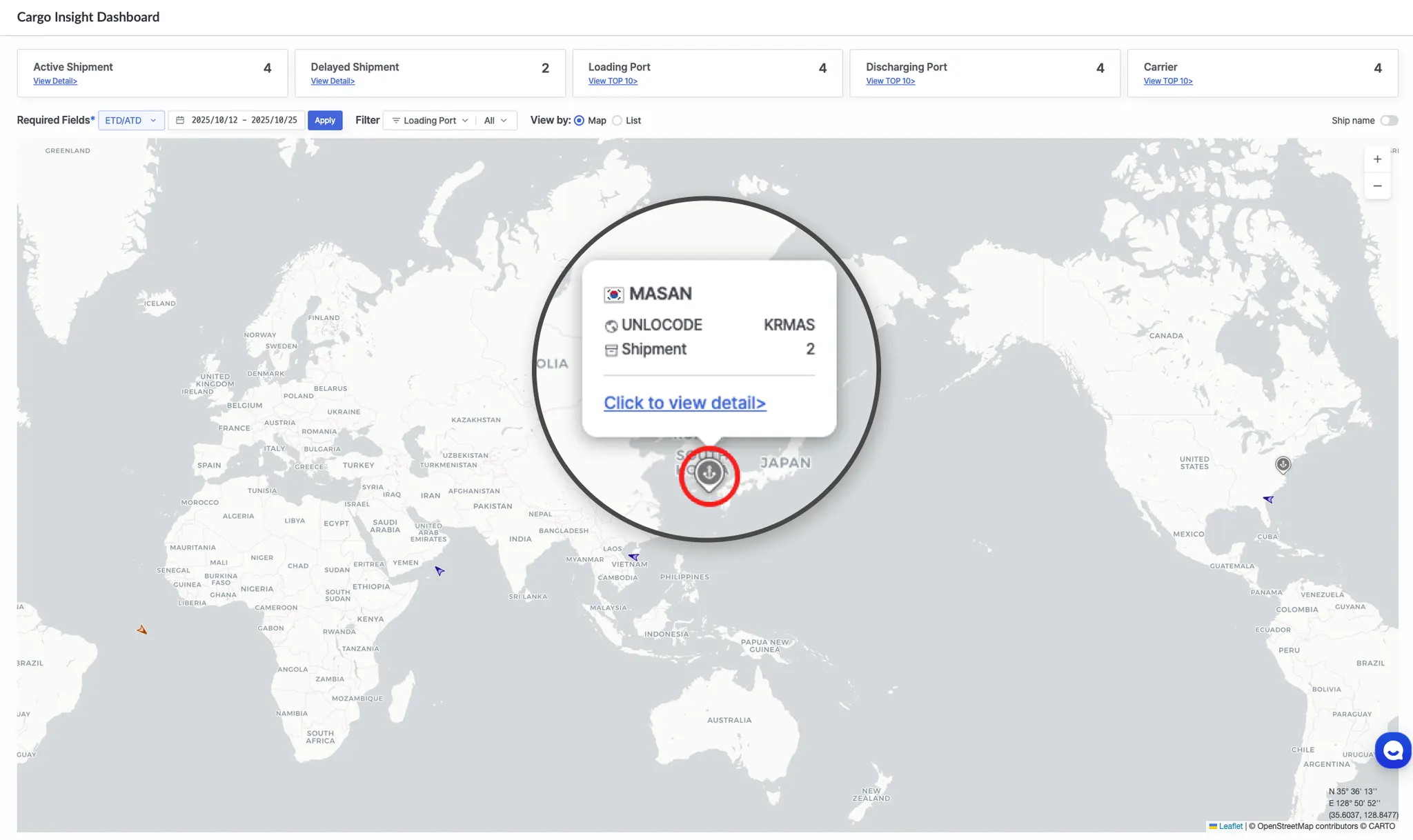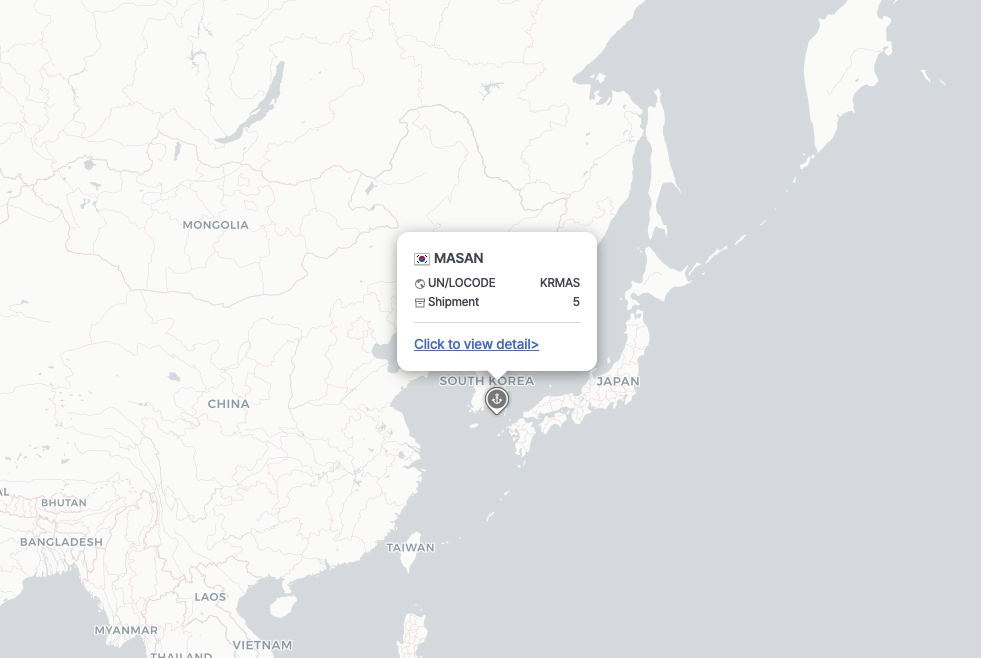 Clicking a gray marker displays the port name, UN/LOCODE, and number of related shipments. Click “Click to view detail” to move to List View and review the related shipments in detail.