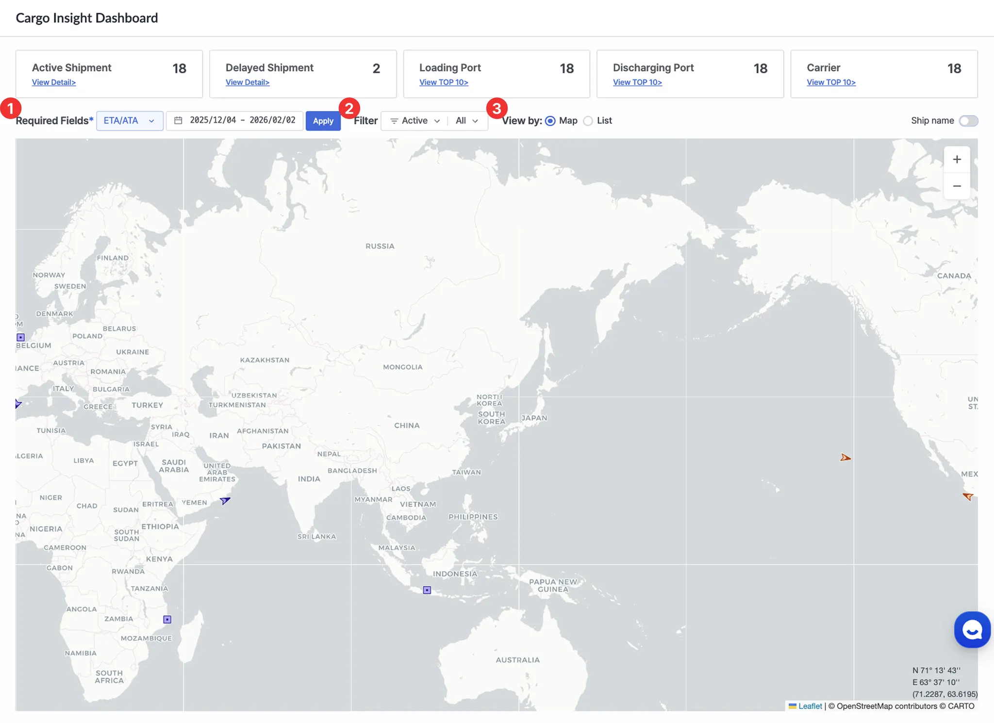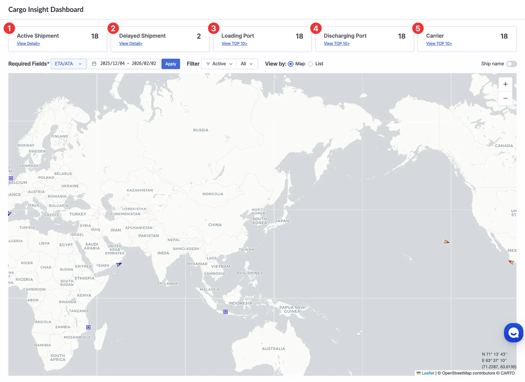 Cargo Insight Dashboard > View by를 Map으로 선택하고, Ship name 토글을 켠 상태