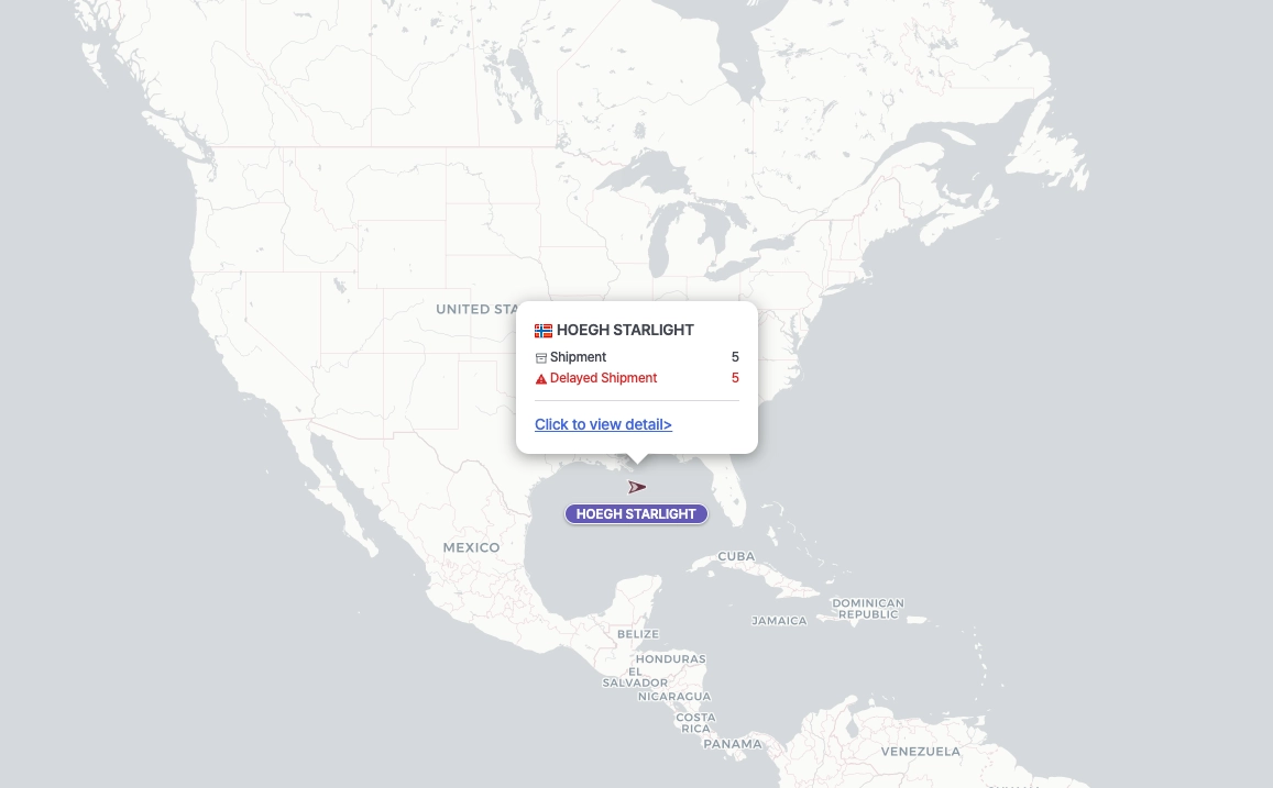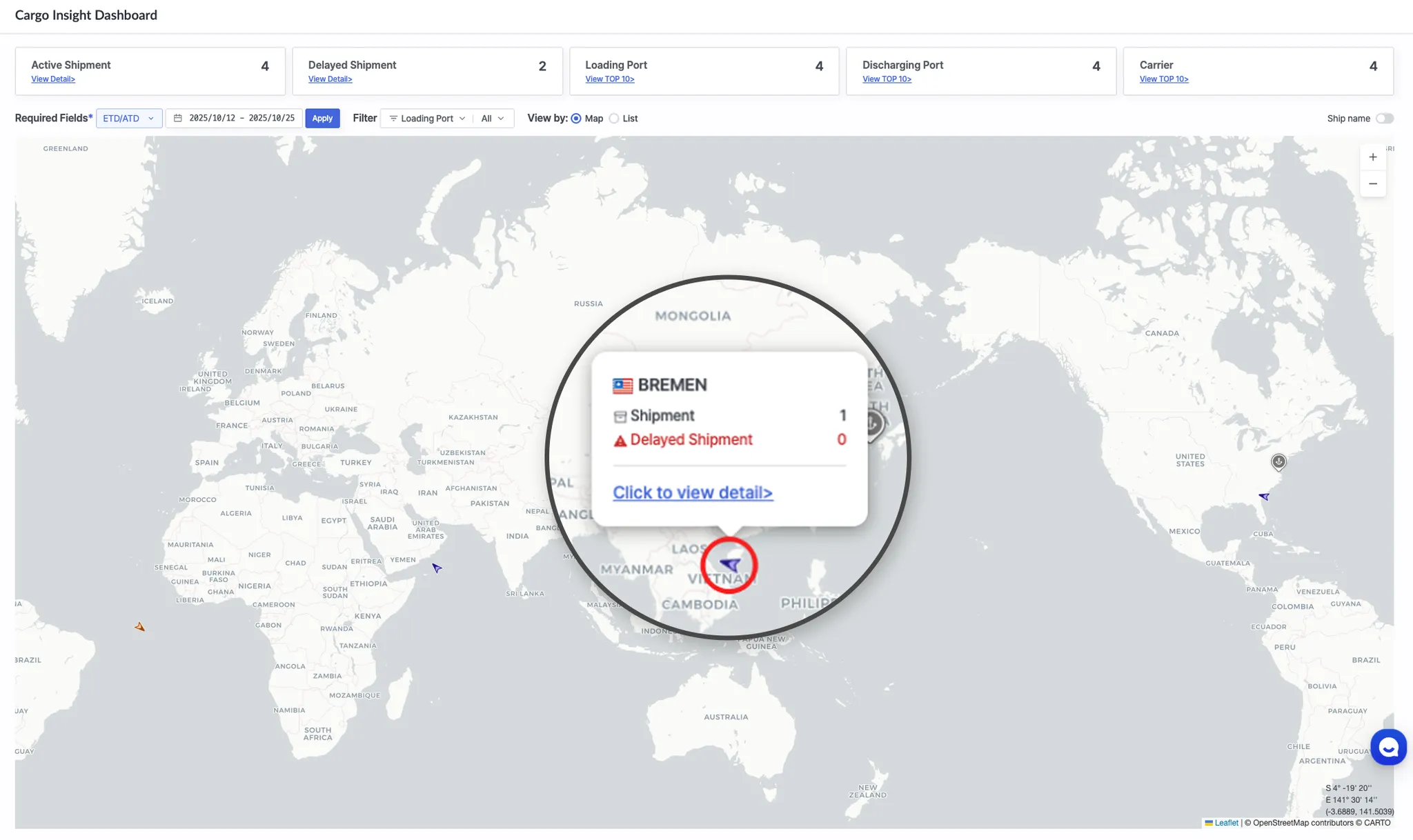 화살표 아이콘을 클릭하면 해당 선박의 선박명, 관련 선적 수, 운송 지연 선적 수를 확인할 수 있습니다. Click to view detail 버튼을 클릭하면 List view로 이동하여 관련 선적을 확인할 수 있습니다.