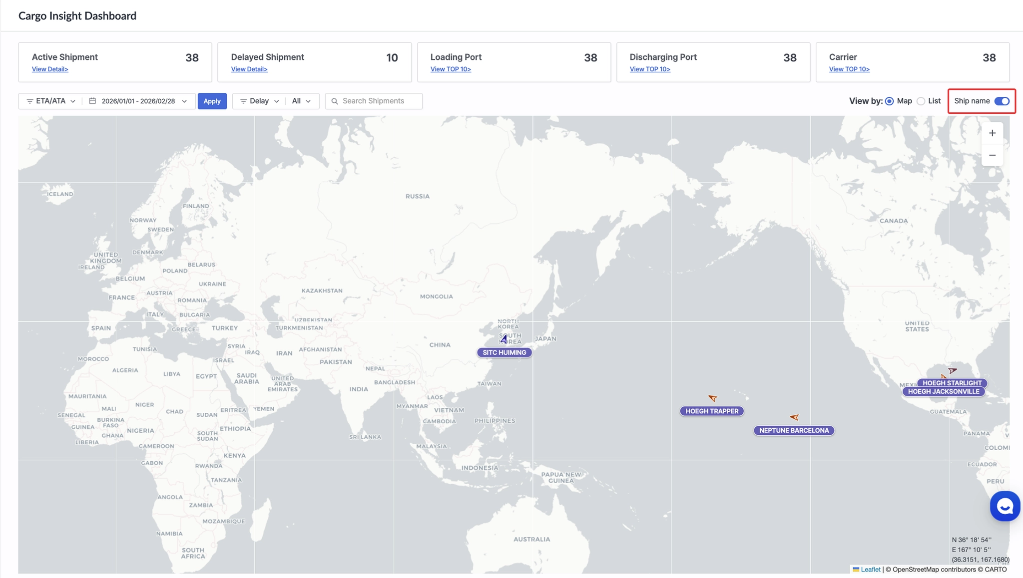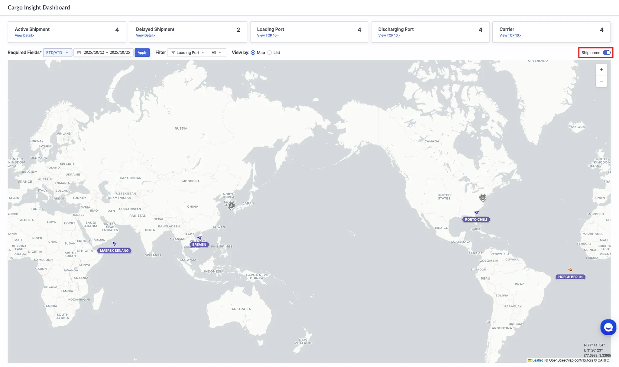 Cargo Insight Dashboard > 지도에서 선박명(Ship Name) 표시 여부를 선택하는 화면