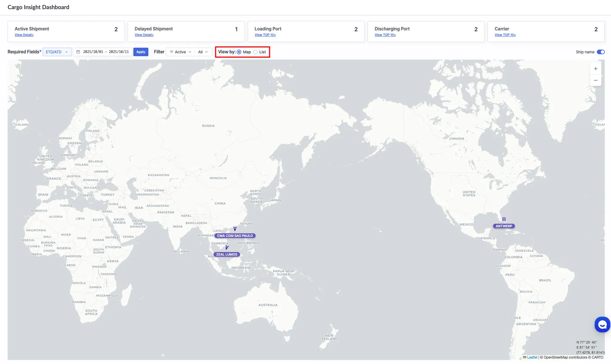 Loading Port | - Displays currently in-transit shipments in the List View and their corresponding loading ports in the Map View.