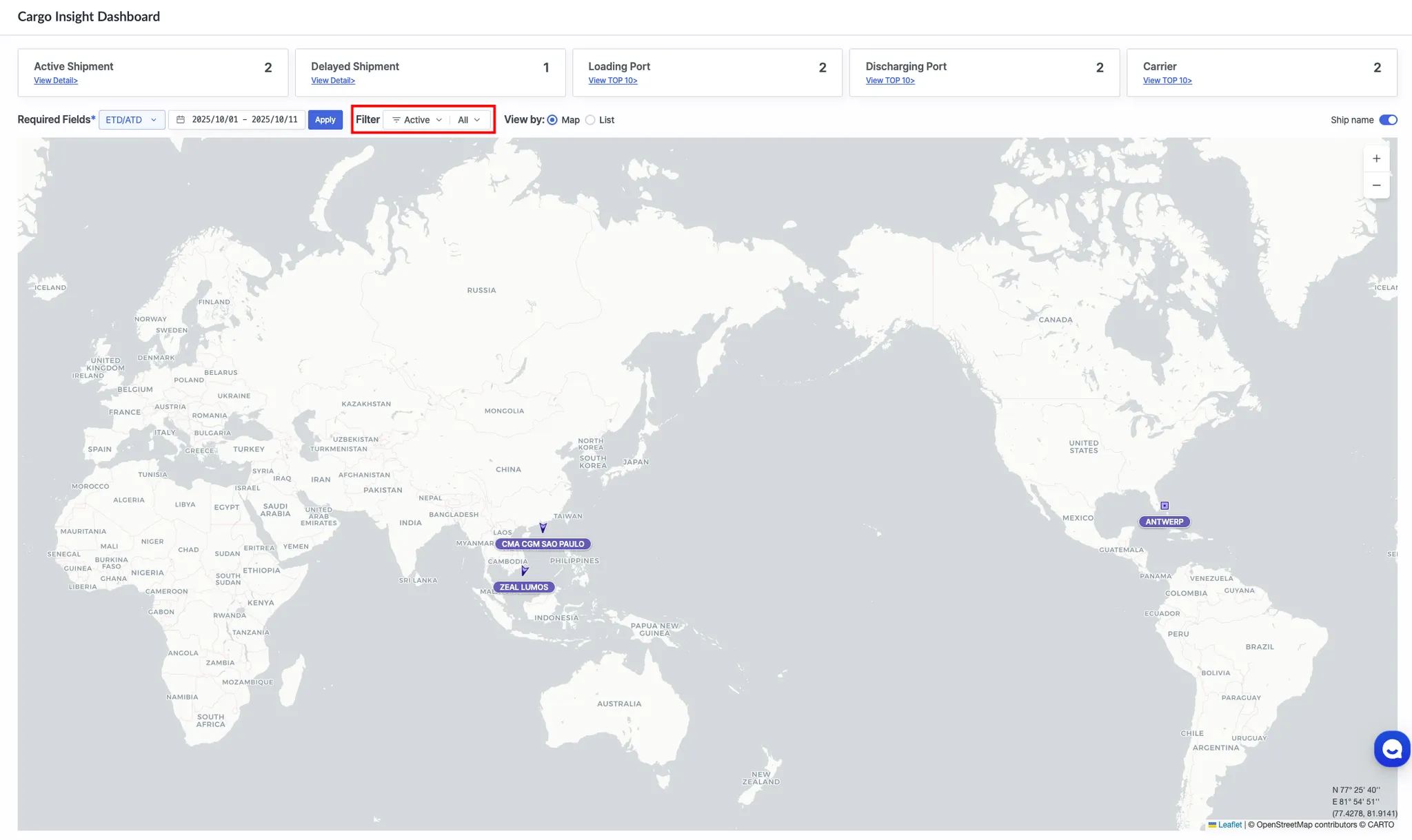 Active | - Displays currently in-transit shipments in the List View and their related vessels in the Map View.
