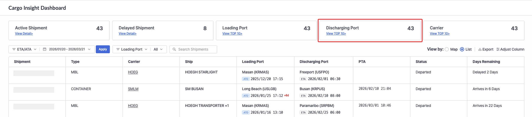 Click View TOP 10 to view the number and ratio of Active and Inactive shipments by discharge port.