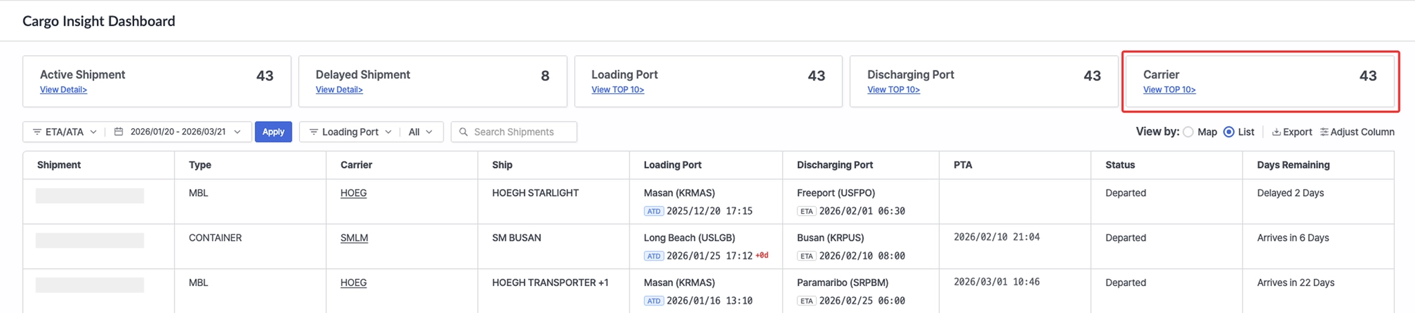 Click View TOP 10 to view the number and ratio of Active and Inactive shipments by carrier.