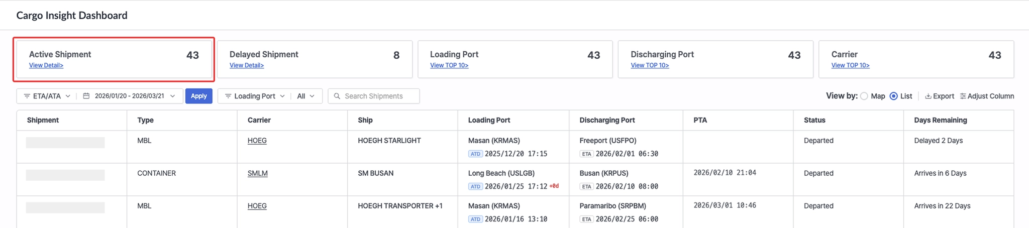 You can view a summary of key shipment statuses for shipments registered in Cargo Insight.