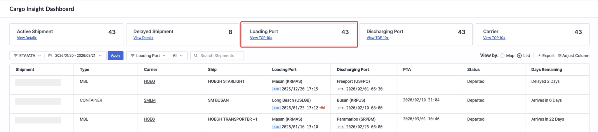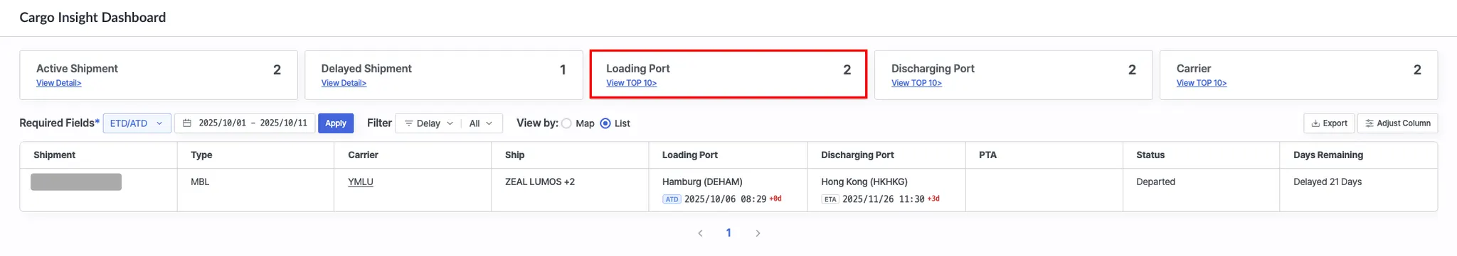 Click View TOP 10 to view the number and ratio of Active and Inactive shipments by loading port.