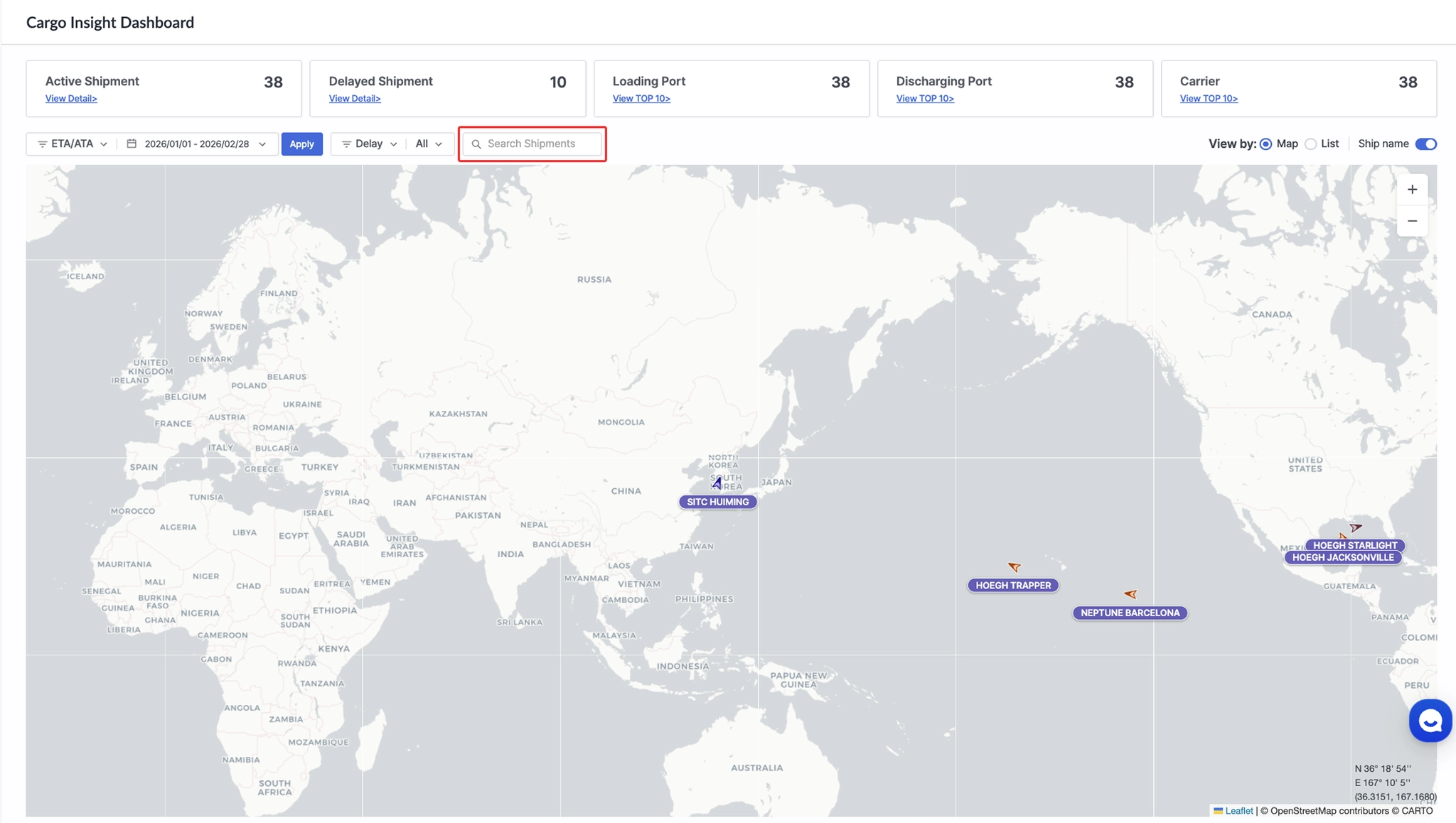 Carrier | - 현재 운송 중인 선적은 List View, 관련 선박은 Map View에 표시합니다.