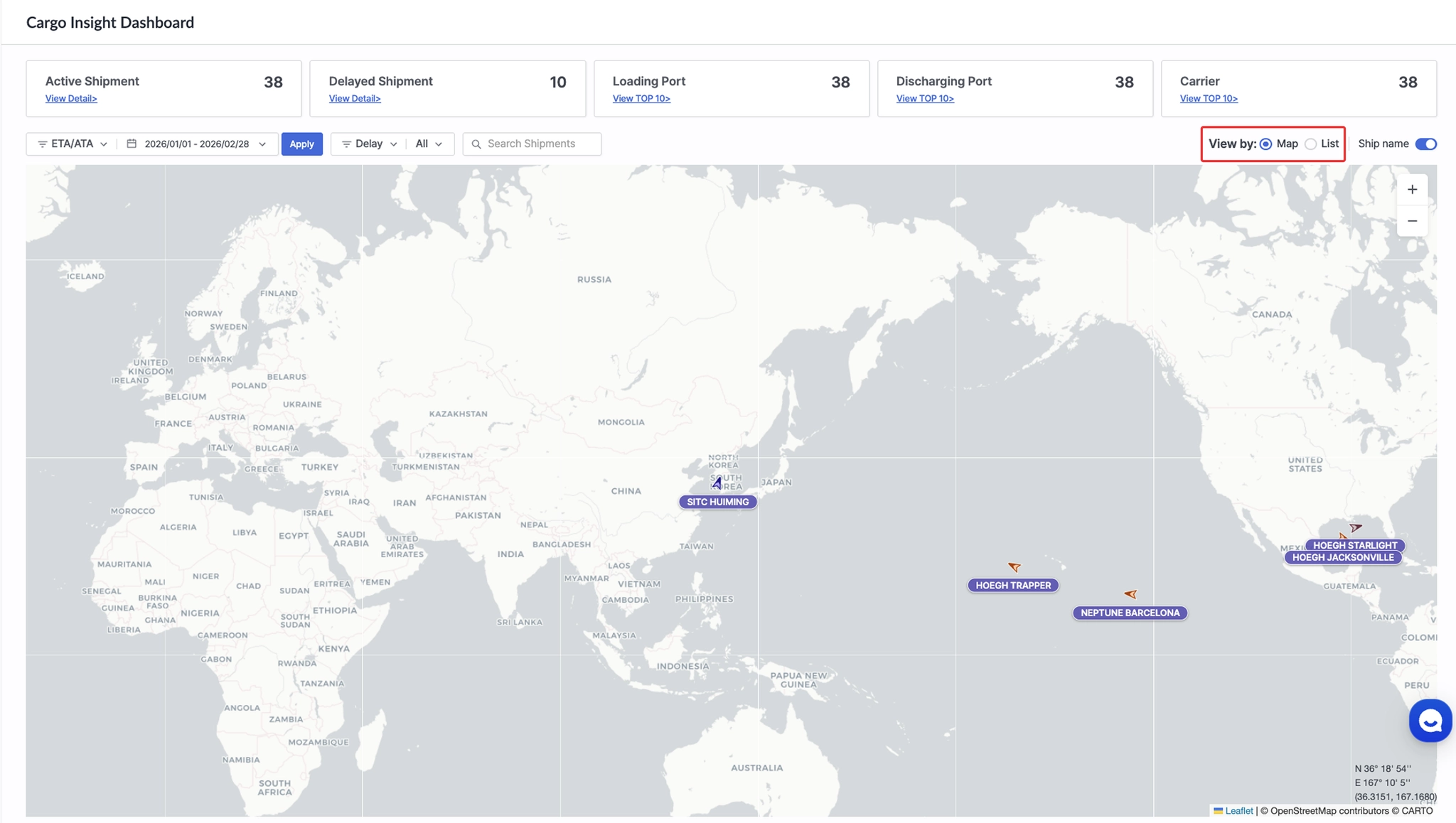 기간 및 필터 설정하여 조회할 선적을 Map View 또는 List View에서 확인할 수 있습니다.