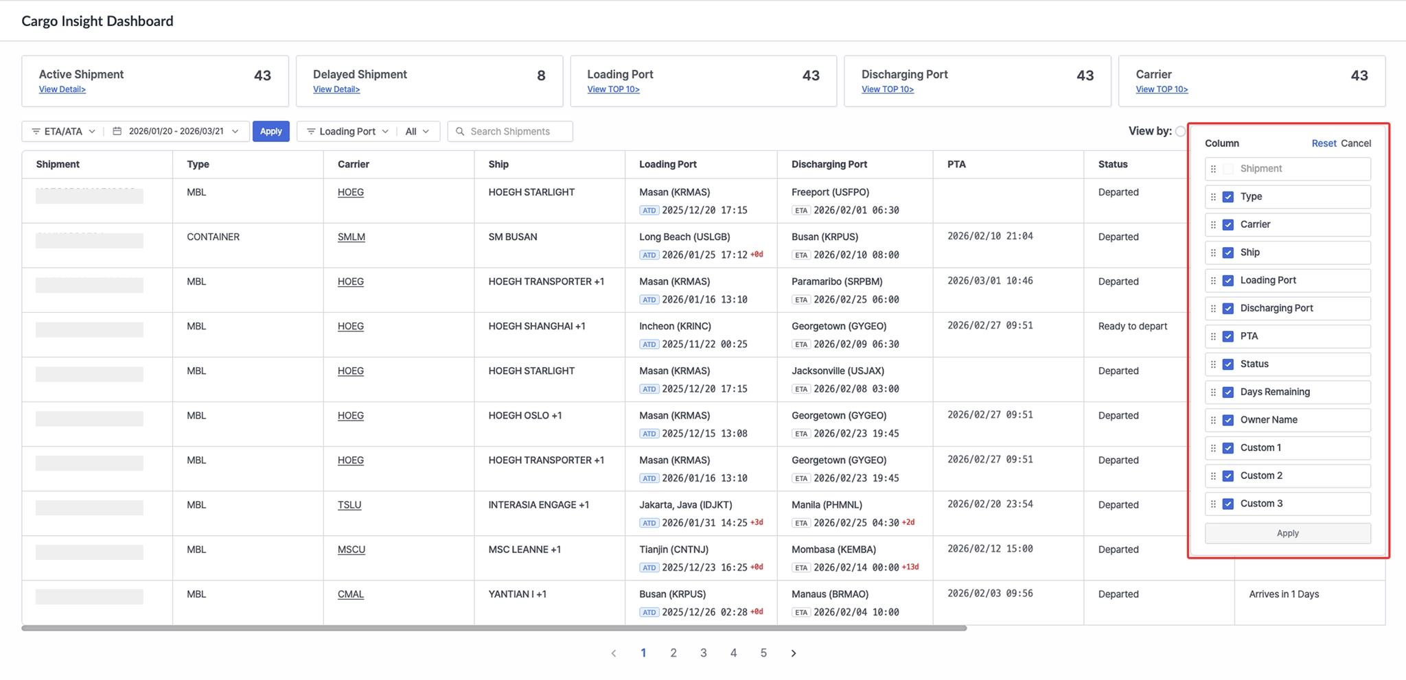 Cargo Insight Dashboard > 우측 Adjust Column 버튼을 선택한 화면