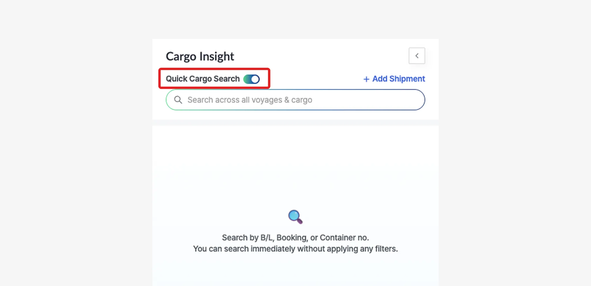 Enable the Quick Cargo Search toggle to instantly search shipments by entering an M-B/L Number, Booking Number, or Container Number in the search field.