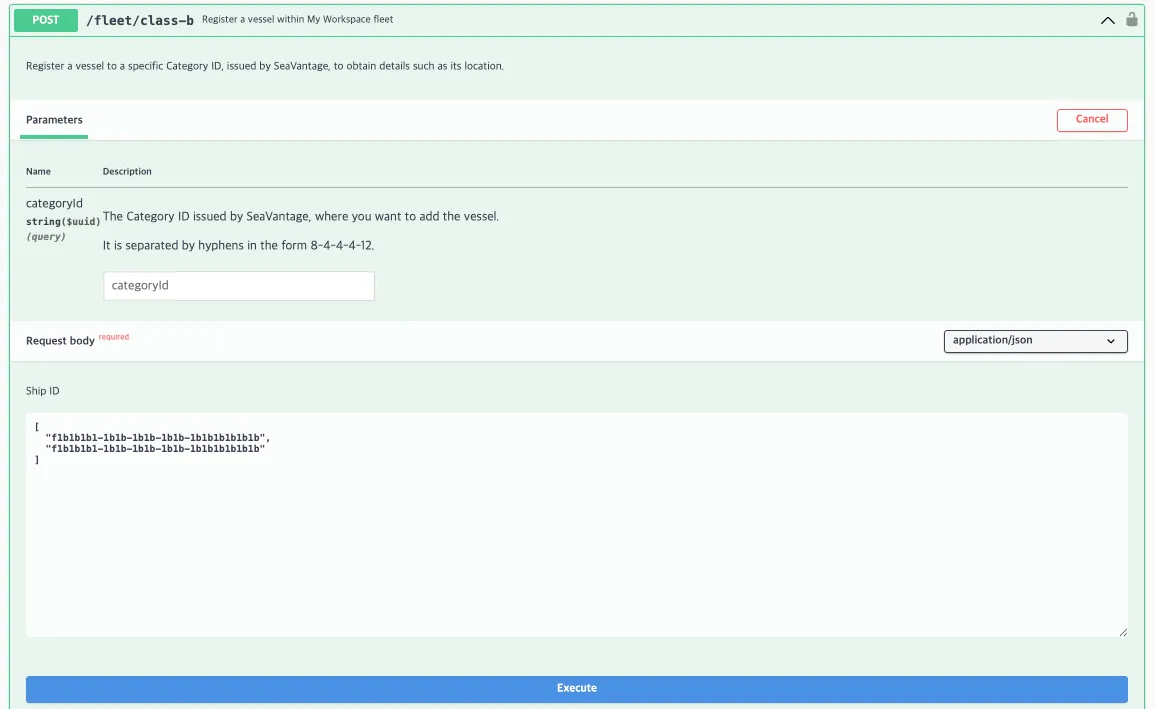 This API registers a Class B vessel to the Fleet under a specified categoryId. If categoryId is not provided, the Class B vessel is registered at the workspace level by default.