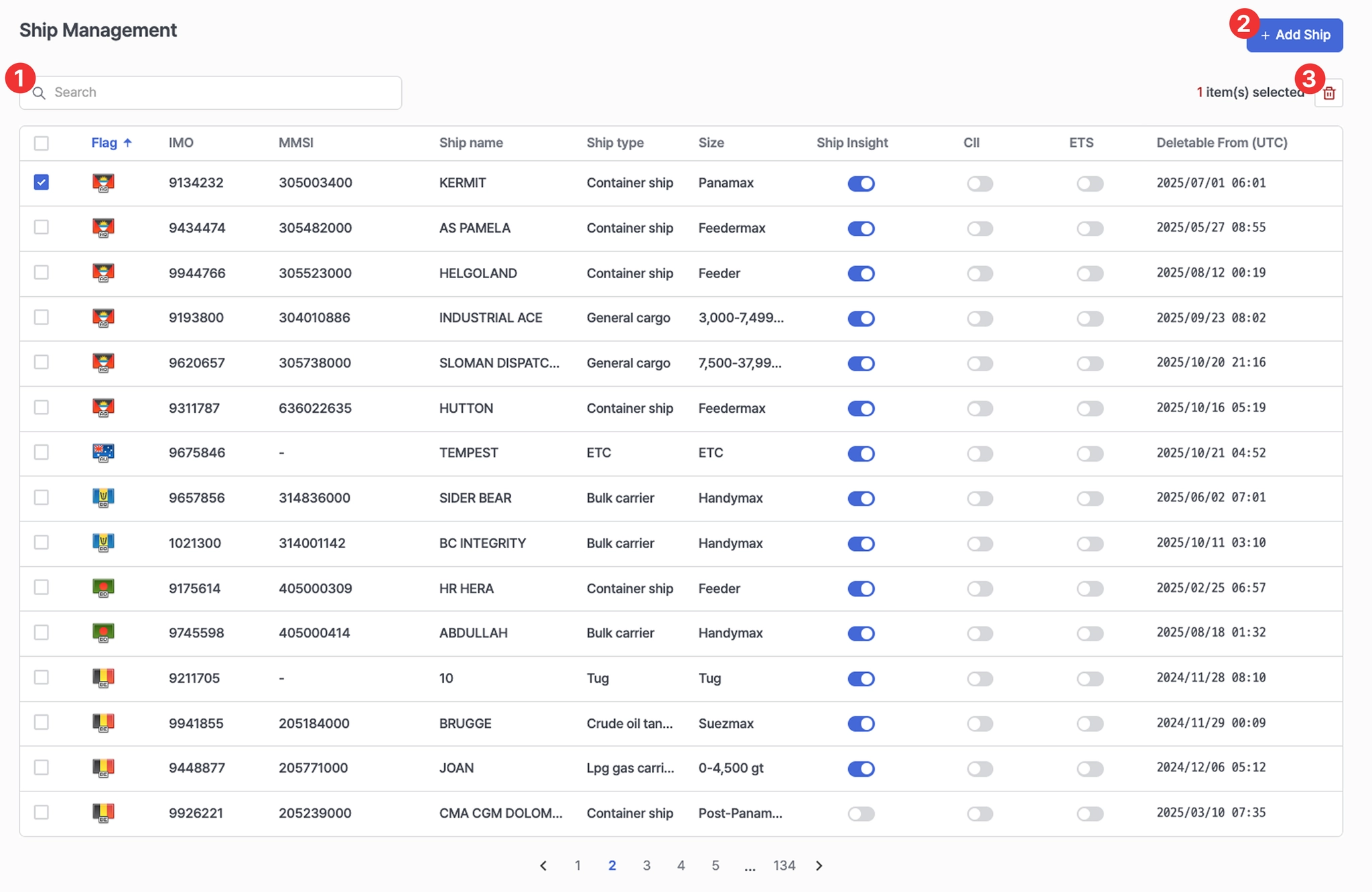 단, 선박 등록 후 7일이 지난 이후부터 삭제가 가능하며, Deletable From (UTC) 날짜 이후 선박 선택이 활성화되며 선택 후 선박을 삭제할 수 있습니다.