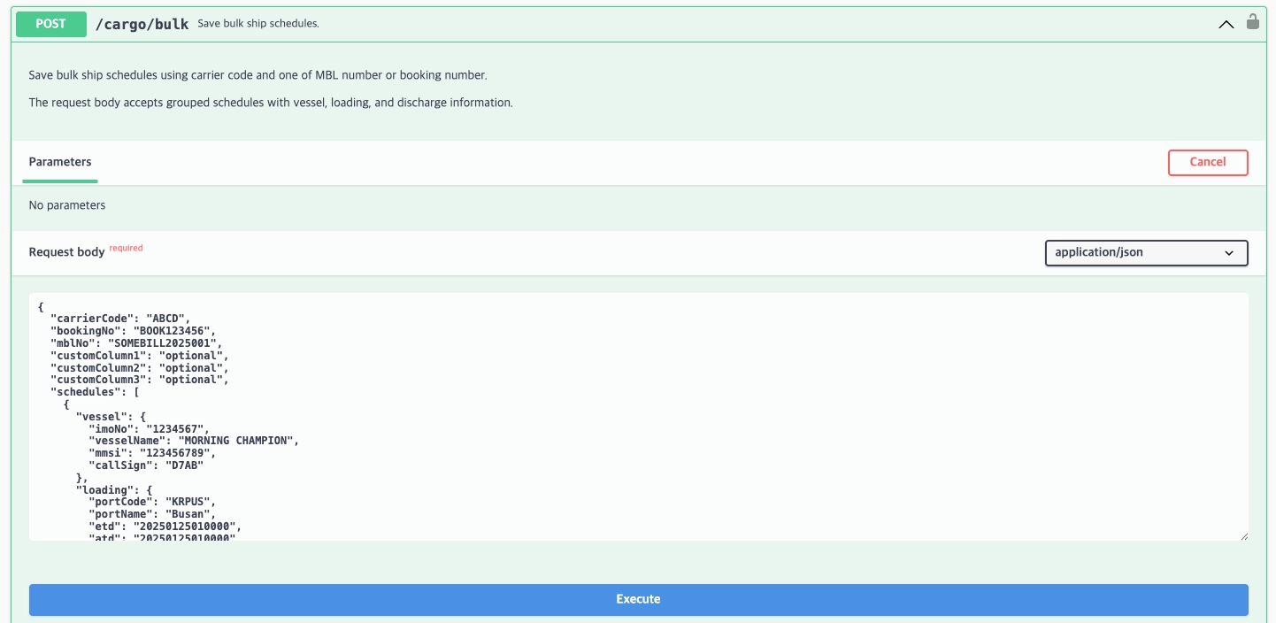 이 API는 carrier code와 MBL 번호 또는 booking 번호 중 하나를 사용하여 선박 스케줄을 일괄 저장할 수 있는 기능을 제공합니다. 운송사는 해당 API를 통해 화물의 세부 정보를 시스템에 등록하거나 업데이트할 수 있습니다.
