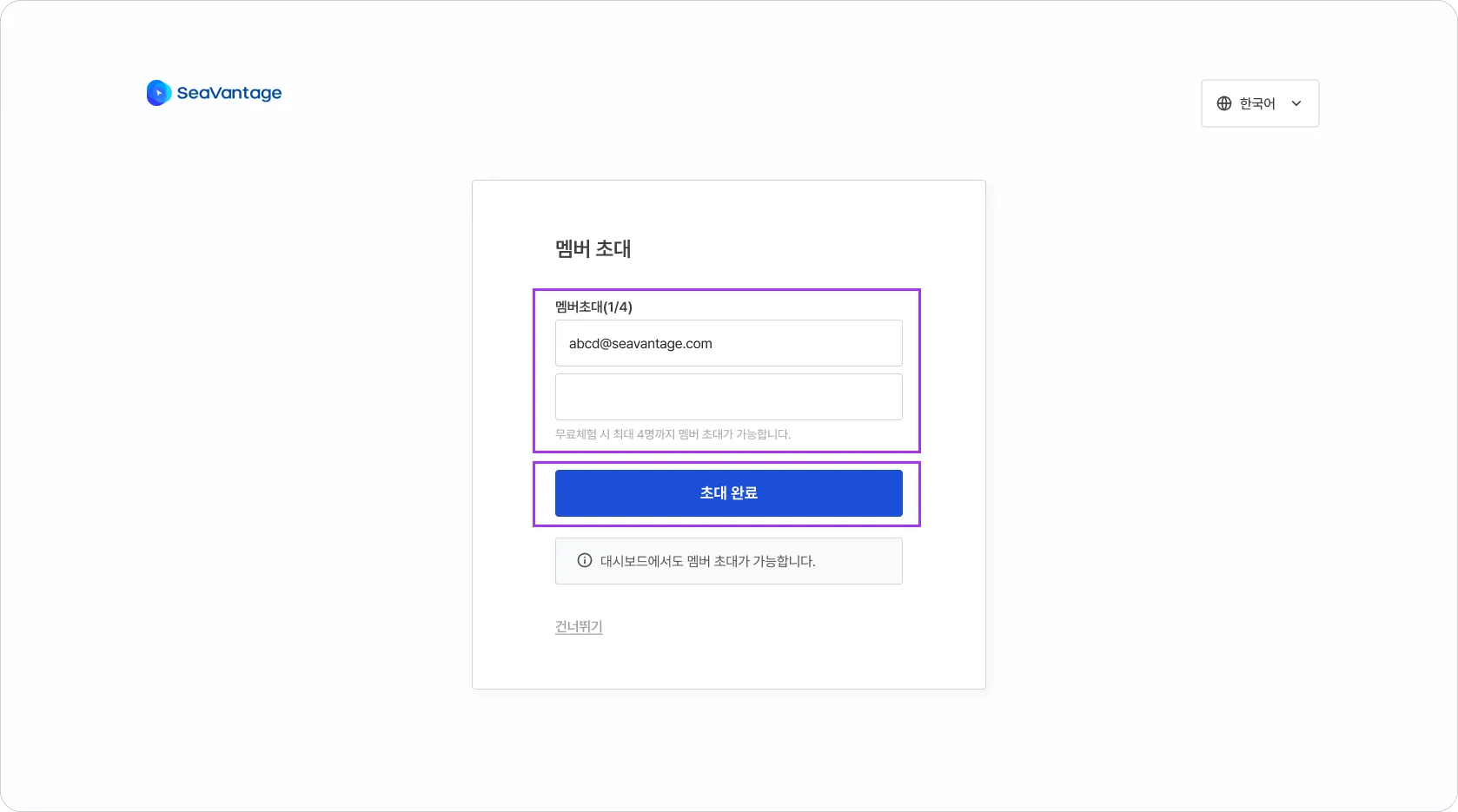 워크스페이스 생성 후 최대 4명의 팀원들을 초대할 수 있습니다.