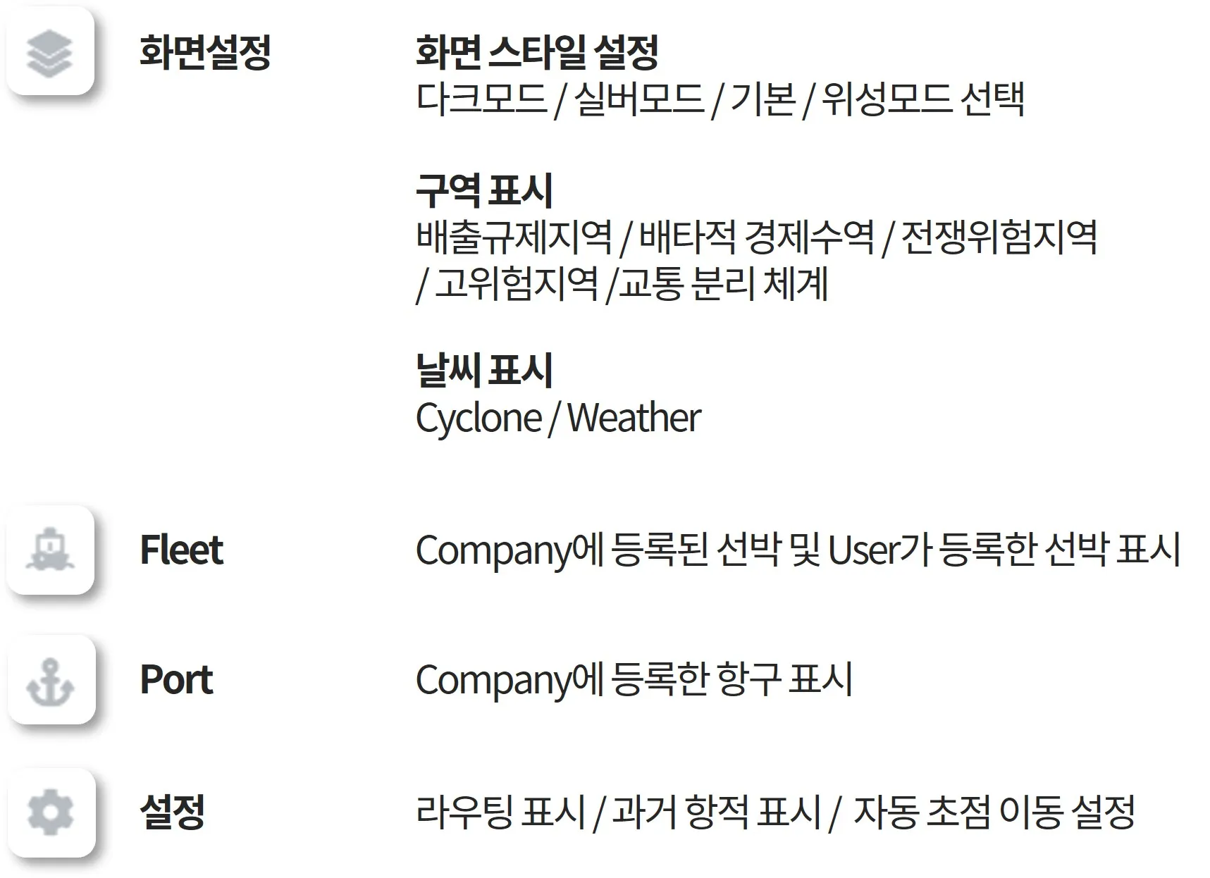 Company에 등록된 선박 필터와 항구 그리고 사용자가 My Fleet에 등록한 선박이 지도에서 표시되며 이외에도 날씨, 지역 등 다양한 설정이 가능합니다.