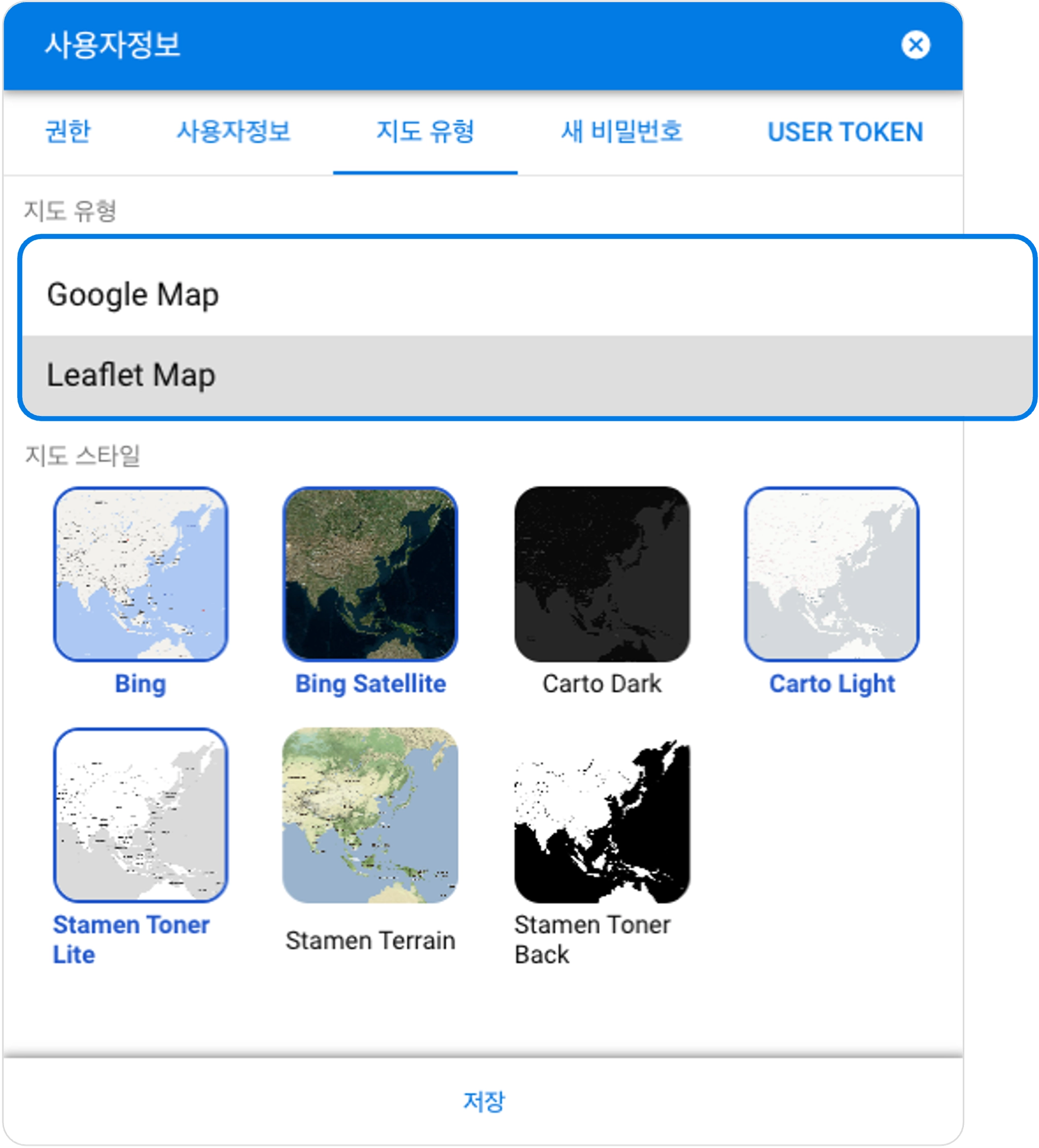 사용자정보 > 지도유형 에서 사용할 지도 스타일을 선택하고 저장합니다.