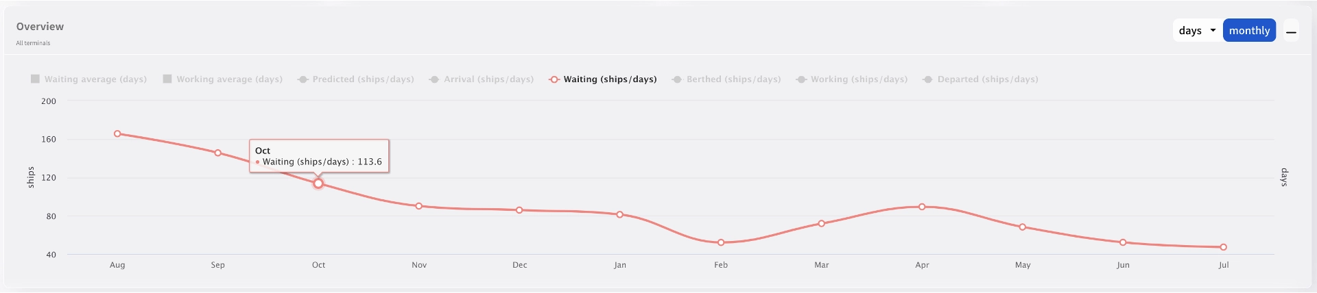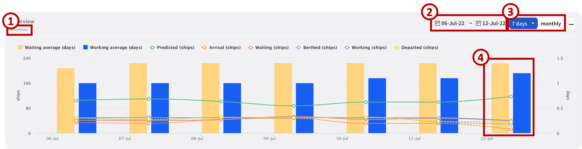 In the case of Waiting, since statistical information is drawn at a specific point in time, the number of ships that arrived a long time ago (ex. a month ago) may be included.