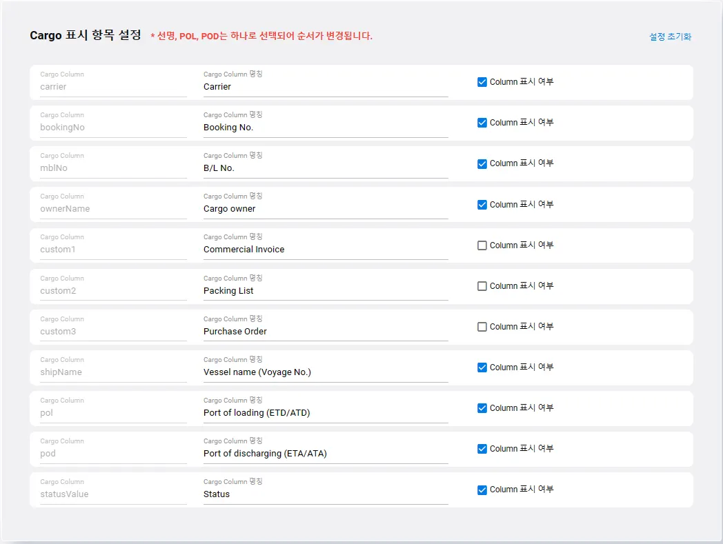 Cargo Insight B/L LIST의 항목과 순서를 설정할 수 있습니다.