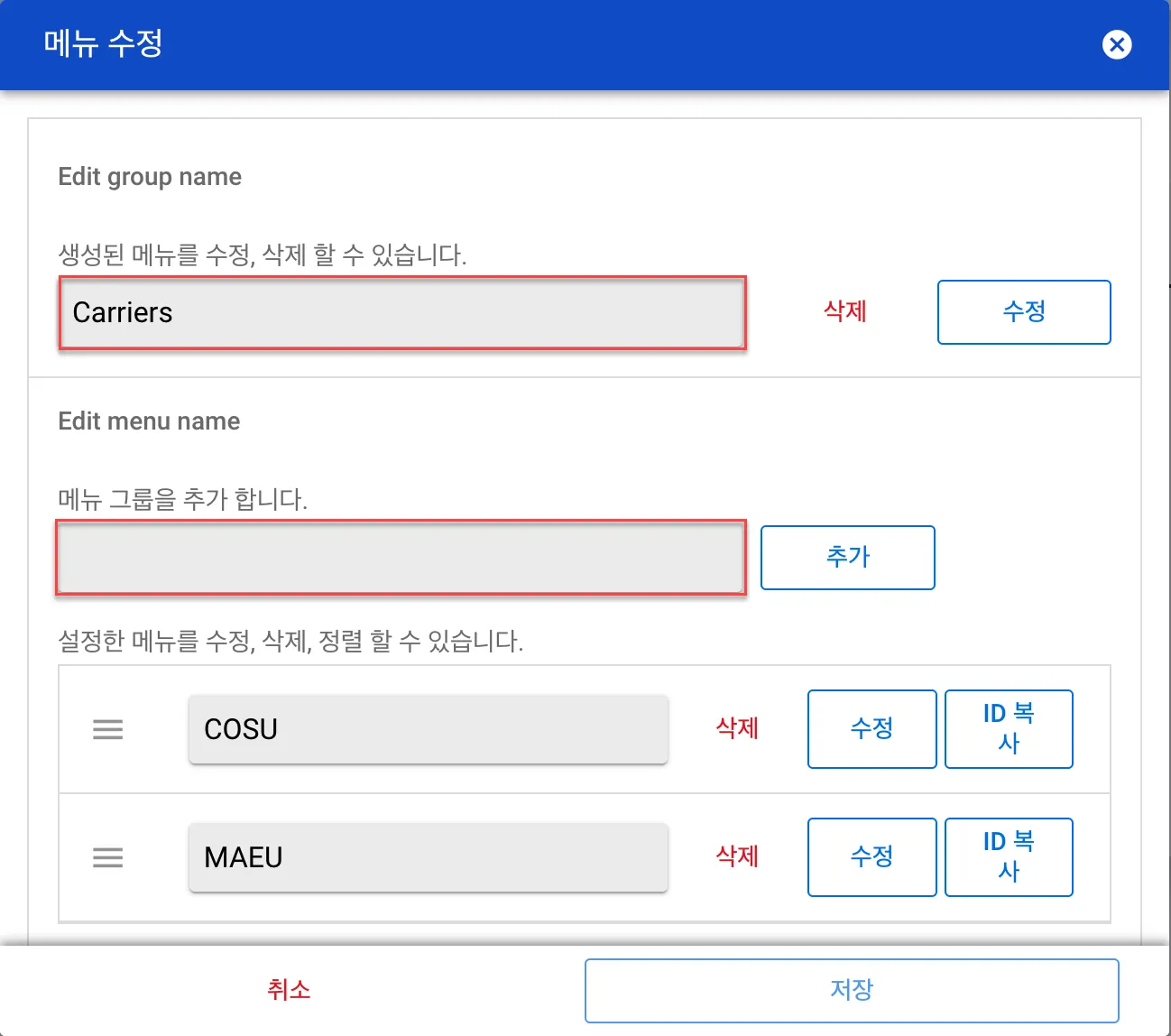 항구 메뉴는 지도에서 필터 기능으로 사용할 수 있으며, + 버튼을 클릭해 새로운 메뉴를 만들고 하위 메뉴 그룹을 생성할 수 있습니다.