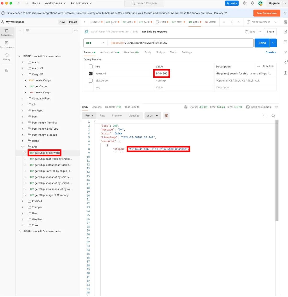 ShipId is acquired by entering the imo of the vessel to be inquired through Ship - get Ship by Keyword.
