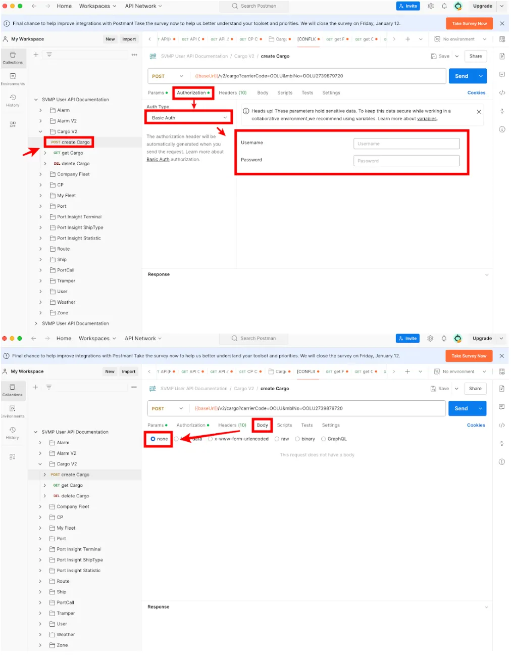 Click on (post) create Cargo API of Cargo V2 tag for BL registration. Then please authenticate (Basic Auth) and set body value to 'none'.