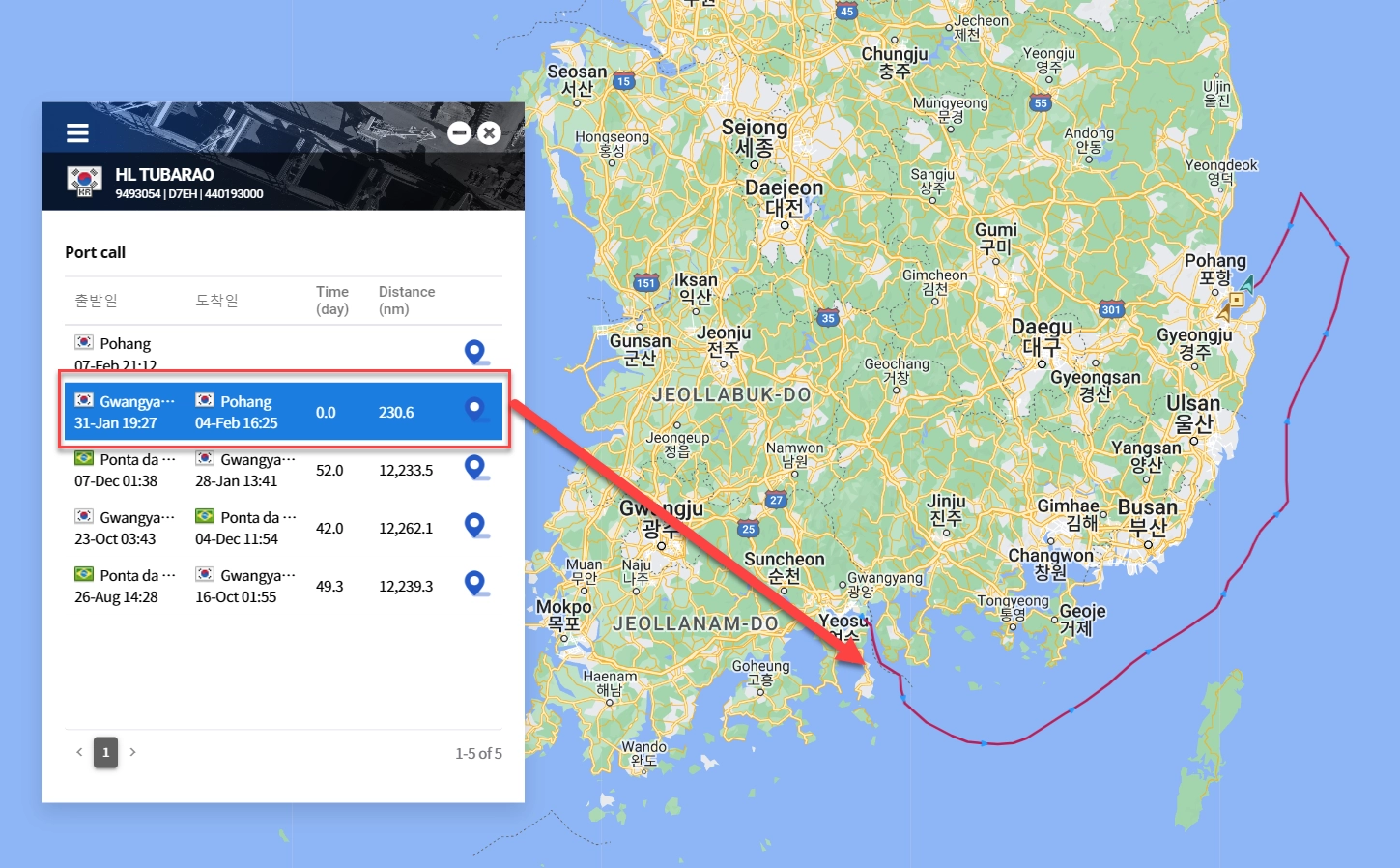 리스트에서 항차를 클릭하면 항차에 해당하는 과거 항적을 지도에 표시합니다.