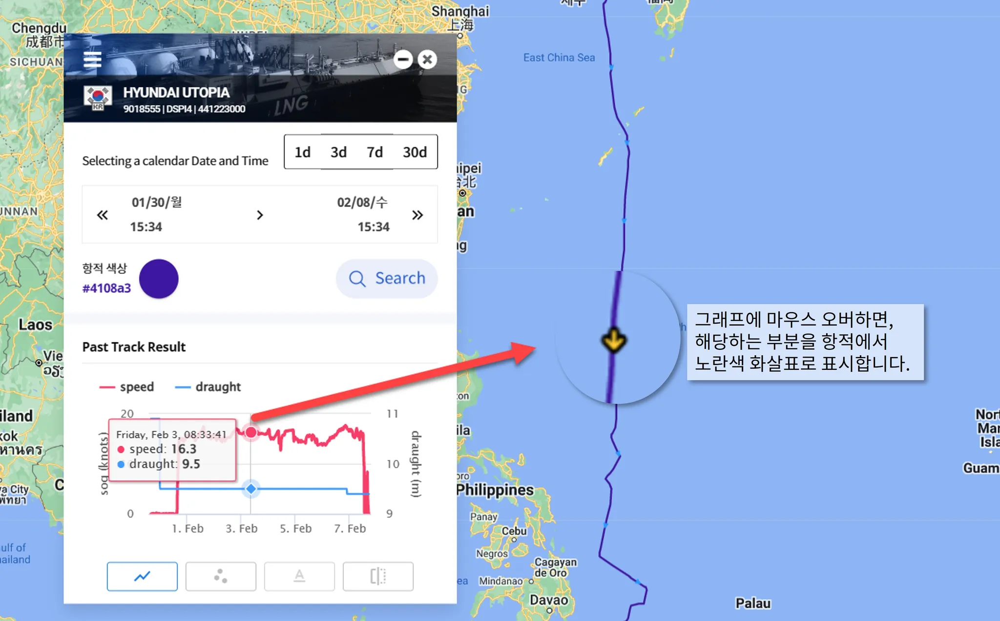 그래프에 마우스를 올려놓으면, 그래프에 해당하는 부분을 항적에서 노란색 화살표로 표시합니다.