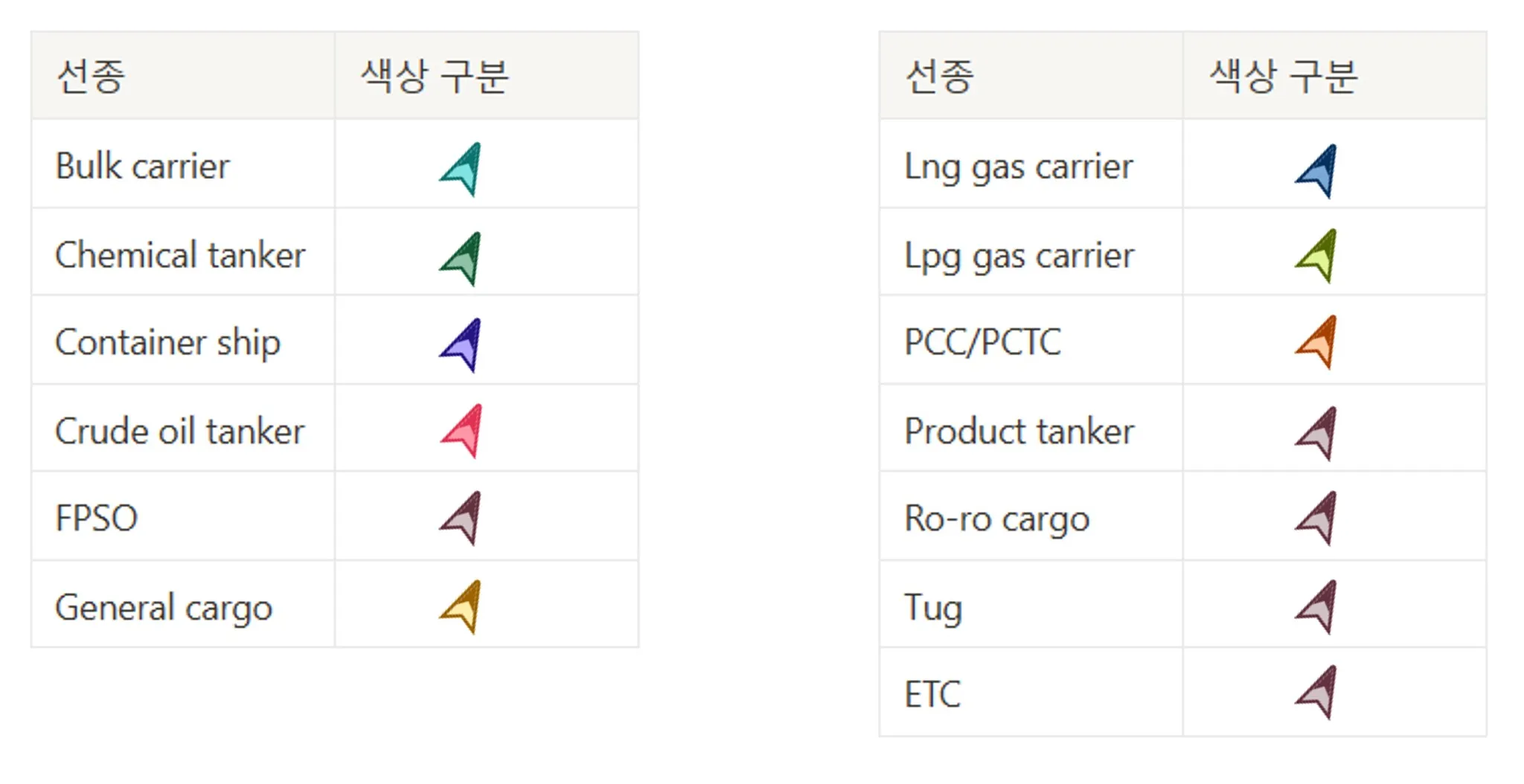 선박 아이콘은 선종 타입에 따라 색상을 구분합니다.