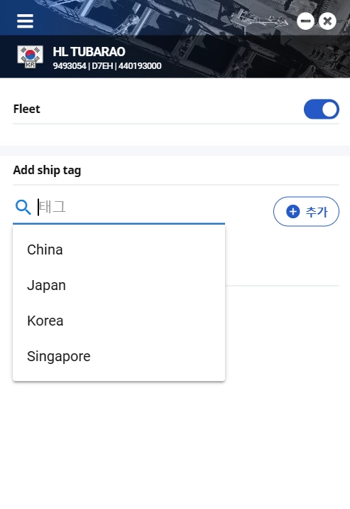 선박 팝업 메뉴에서 tag manage 를 클릭하면, 해당 선박의 태그를 설정할 수 있습니다.