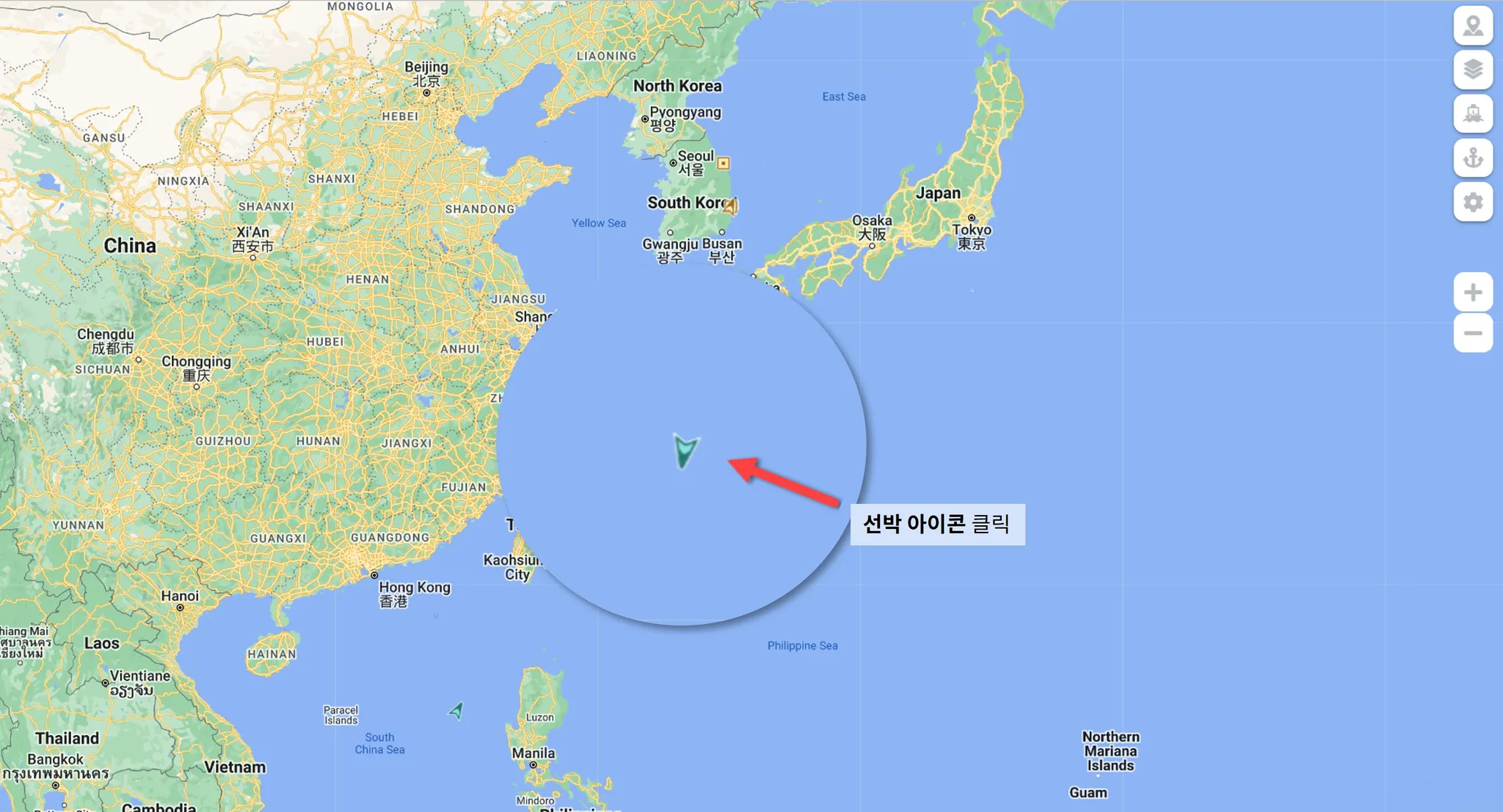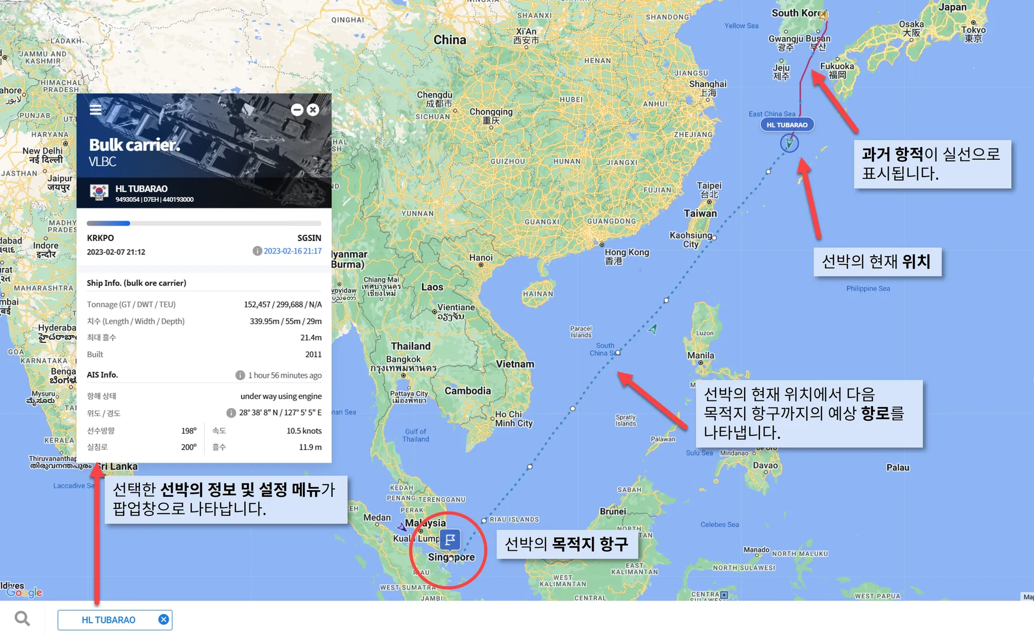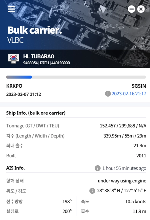 지도 또는 하단 검색을 통해 추적하고자 하는 선박을 클릭합니다.