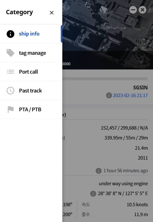 선박 팝업창에서는 선사에서 제공한 ETA는 물론, 씨벤티지 자체 데이터와 분석 기술을 적용한 PTA(Predicted Time of Arrival), PTB(Predicted Time of Berthing) 를 확인할 수 있습니다.