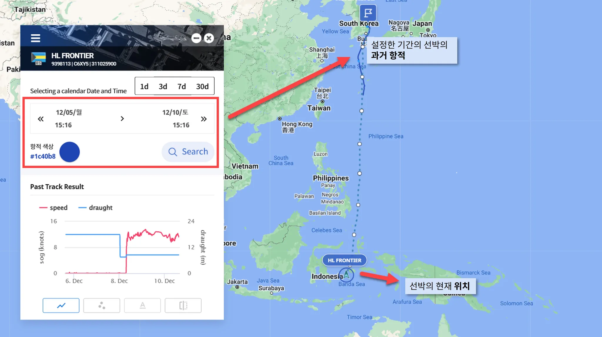 Past Track 메뉴에서는 기간을 설정하여 선박의 과거 항적을 조회할 수 있습니다.