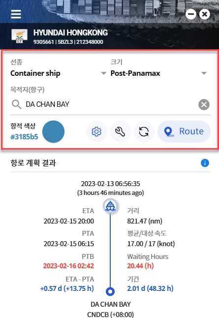 선종, 크기, 목적지 항구를 설정하여 Route 버튼을 클릭하면, 선박의 현재 위치에서 설정한 목적지 항구까지의 라우팅 및 예측 도착시간을 확인해 볼 수 있습니다.