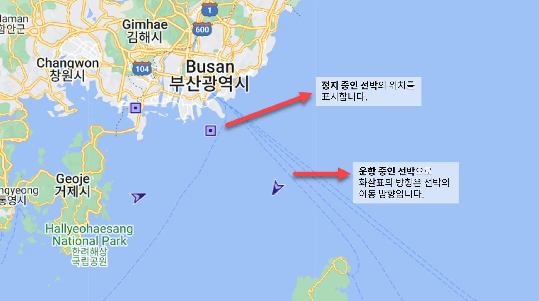검색 기간과 상관없이 현재 선박의 목적지 항구에 대한 라우팅은 점선으로 표시됩니다.