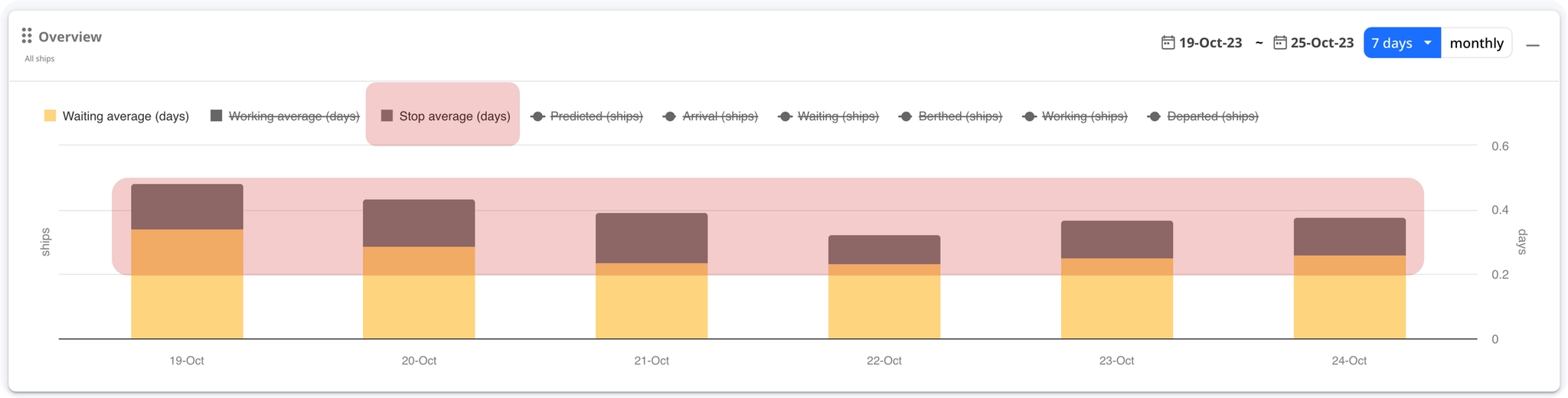 Arrival과 Berthed 는 24시간(전날 정오 ~ 당일 정오)이라는 기간 조건이 있습니다. 따라서, 해당 항구의 최근 대기 상황 및 최근 접안 작업에 대한 경향을 참고할 수 있습니다.