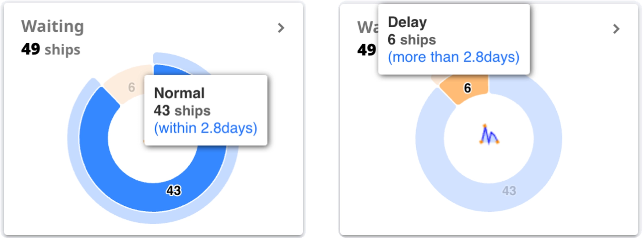 파란색은 항구별 평균보다 대기시간이 적은 선박의 수를 의미하며, 반대로 오렌지색은 항구별 평균보다 대기시간이 긴 선박의 수를 의미합니다. 마우스를 해당차트에 올려놓으면 평균시간을 확인해 보실 수 있습니다.