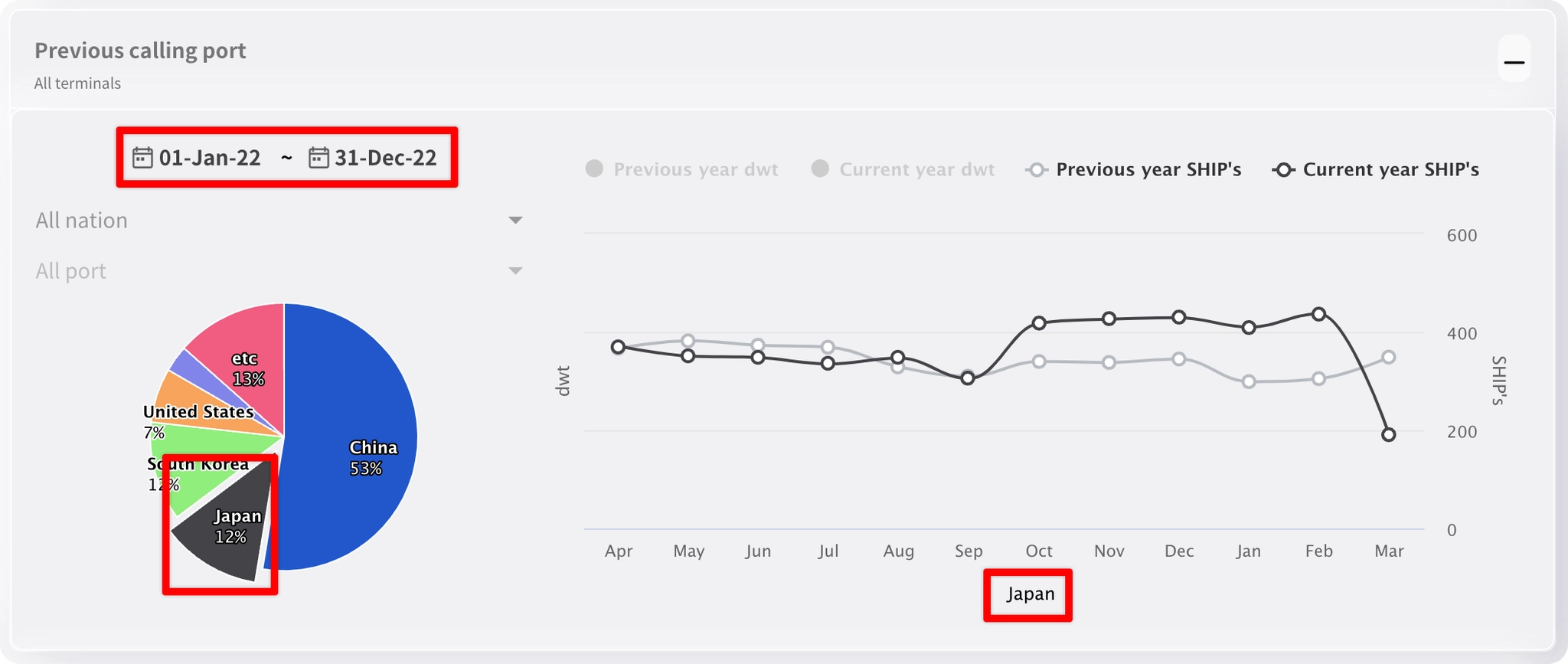 : 원형 차트에서 터미널을 클릭하여 해당 국가 특정 포트의 터미널별 통계 차트를 확인할 수 있습니다.