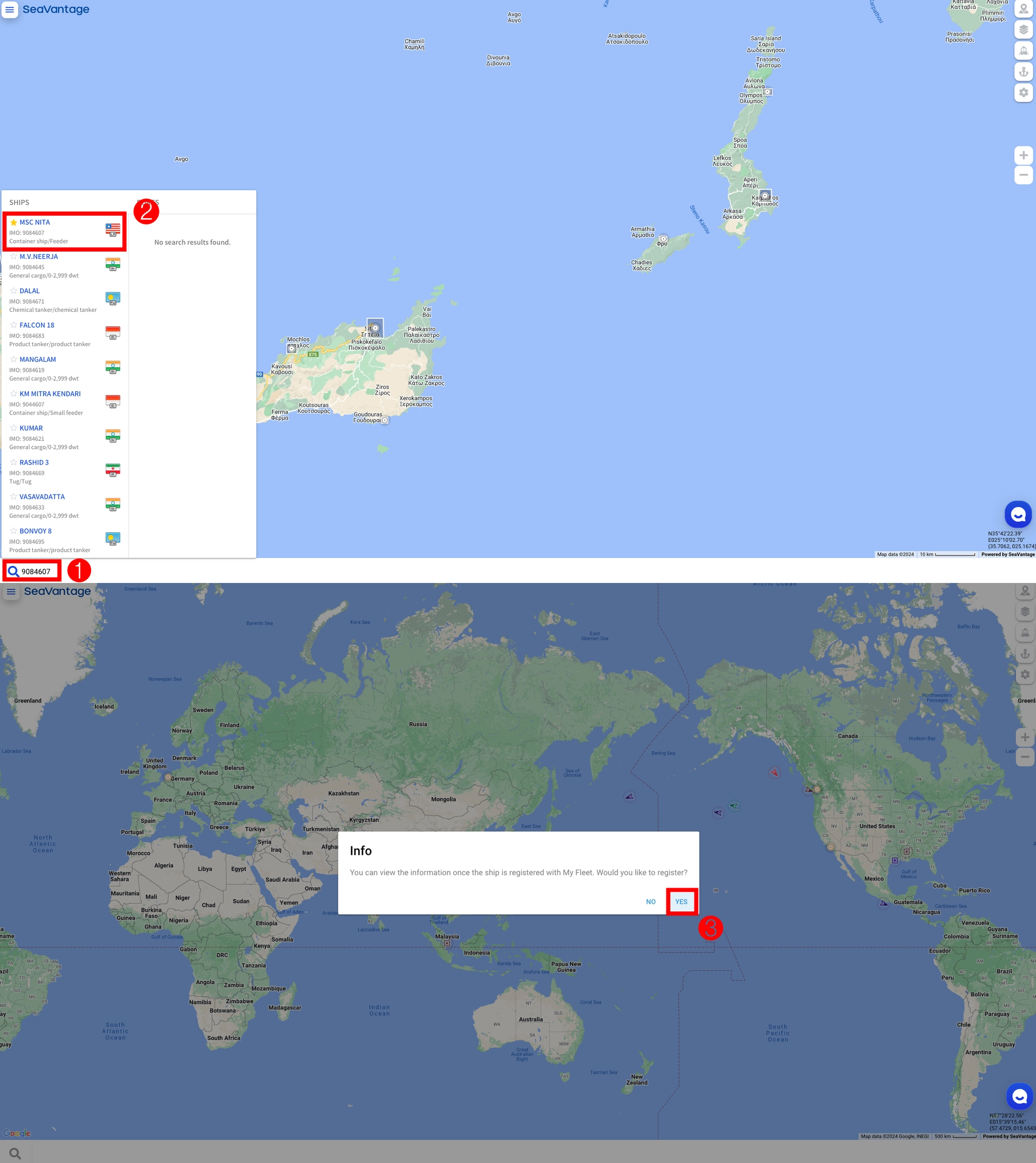 ③ Input any of the following: ship’s name, IMO or MMSI on the search bar.