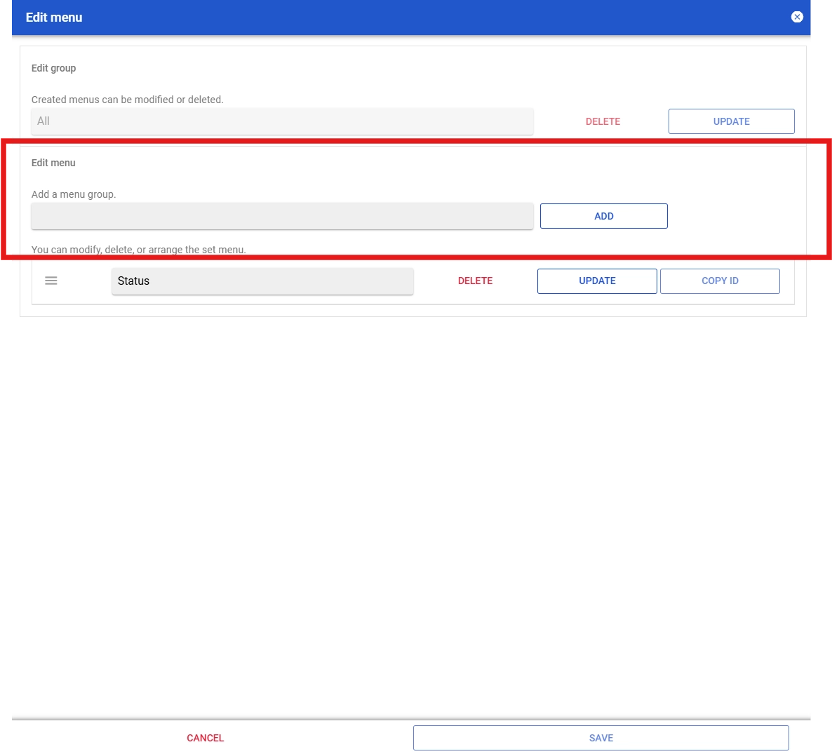 Once the ‘Edit menu’ pop-up appears, input the group name and click on the ‘Add’ button